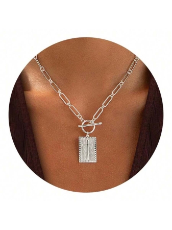 1-Piece Gold And Silver Cross Pendant Necklace For Women, Toggle Clasp Rectangle Cross Charm Necklace, Dainty Paperclip Chain Religious Jewelry Gift For Christian Faith, Baptism, First Communion