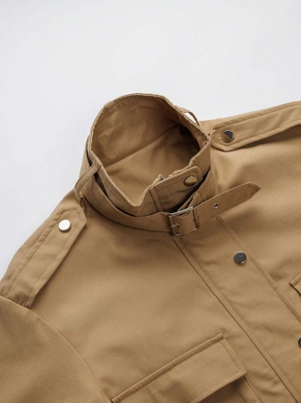 1pc Women’s Fashionable Solid Color Long Sleeve Front Zipper Casual Short Jacket, Khaki High Collar Long Sleeve Jacket With Button Detail And Pockets, Regular Hem, Non-Stretch