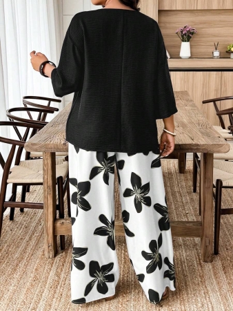 2pcs Plus Size Casual Vacation Set: Solid Color Shirt & Floral Print Wide Leg Pants