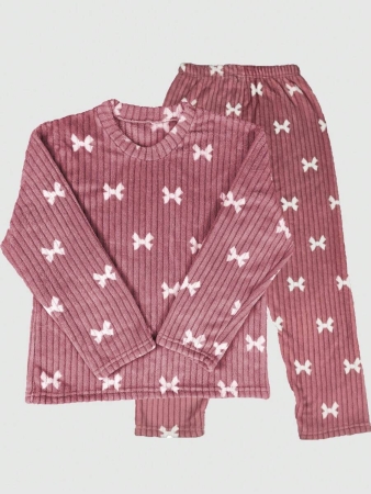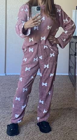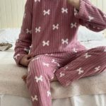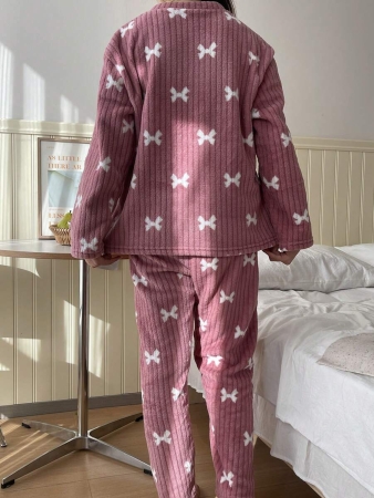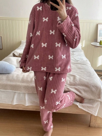 3 reviews for 2pcs Set Coral Fleece & Flannel Bow Top & Pants Fluffy Pajama Set, Simple Print Sleepwear , Two Pieces Set, Fall Winter Clothes, Cozy