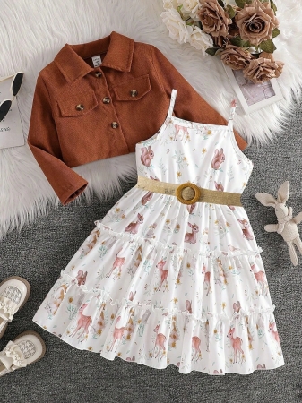 2pcs/Set Young Girls Fashion Blazer Collar Long Sleeve Jacket + Cartoon Animal Print Suspender A-Line Cake Dress, Casual Outfit For Daily Wear & Holiday, Spring/Autumn