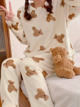 2pcs Winter Sleepwear Set, Flannel Fluffy Pajama Set With Cute Bear Print, Simple And Fashionable Sleepwear,Two Pieces Set, Fall Winter Clothes