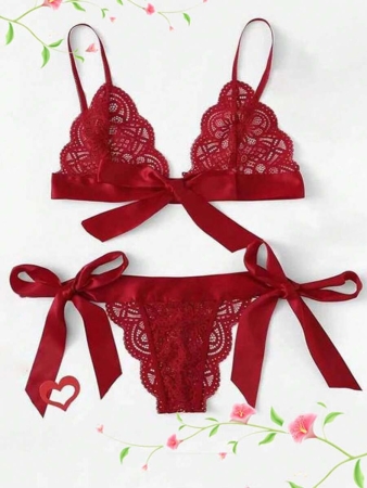 2pcs Women Sexy Lace Lingerie Set, 3-Piece Hollow Out Bowknot Erotic Underwear, Rave