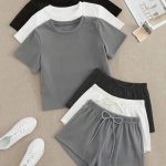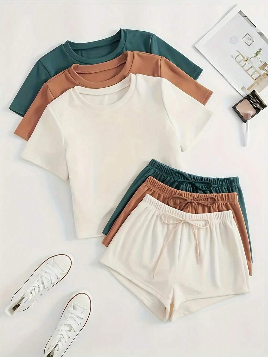 3pcs Women Comfortable Pajama Sets: Short Sleeve Round Neck Top And Loose Shorts – Easy Care, Drawstring, Knitted Fabric, Suitable For Spring/Summer Sportswear And Outdoor, Great For Summer Nights And Leisure Days, Lounge Outfit