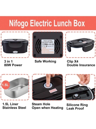 3 reviews for 80W Black Electric Lunch Box Food Heater, Food Warmer For Car Truck Office, 1.5L Stainless Steel Self-Heated Lunchbox For Adult, Portable Heating Box With Adapters Fork Spoon Insulated Bag