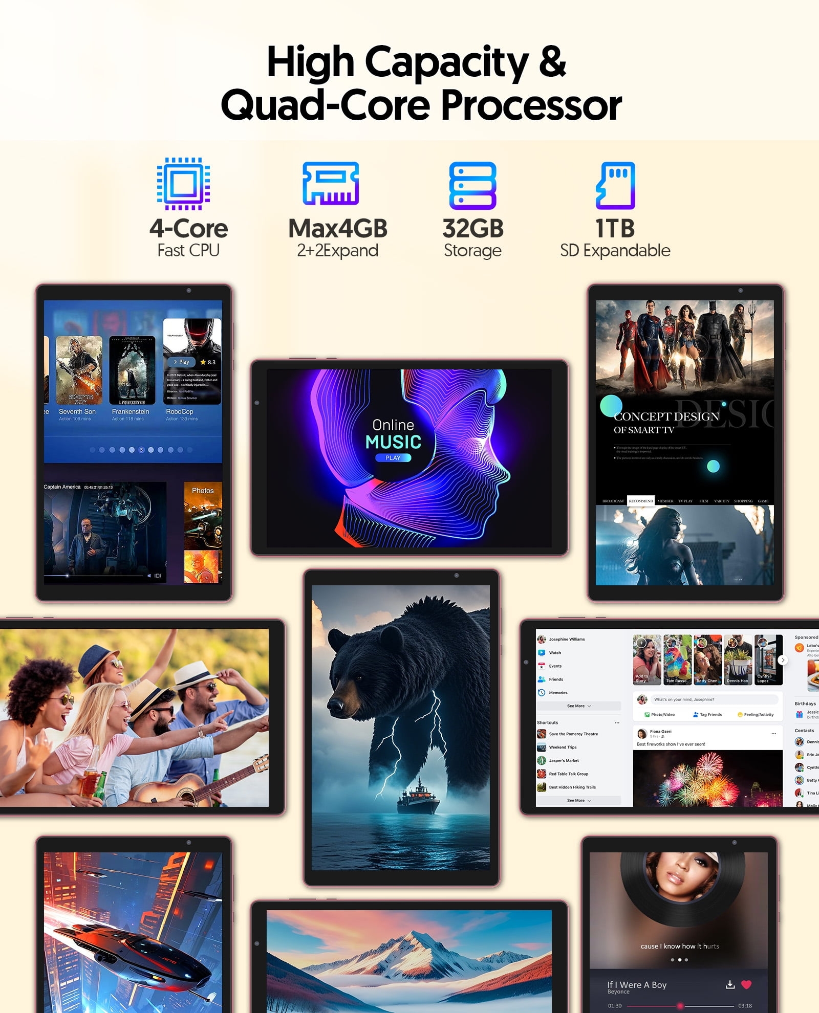 - 4GB+32GB Storage+1TB Extend:4GB (2GB+2GB expansion) RAM+32GB ROM,can be expanded up to 1TB SD card (not included), you can download and store your favorite books, songs, photos, movies, games and anything you want. You can fully enjoy without worrying about running out of space.