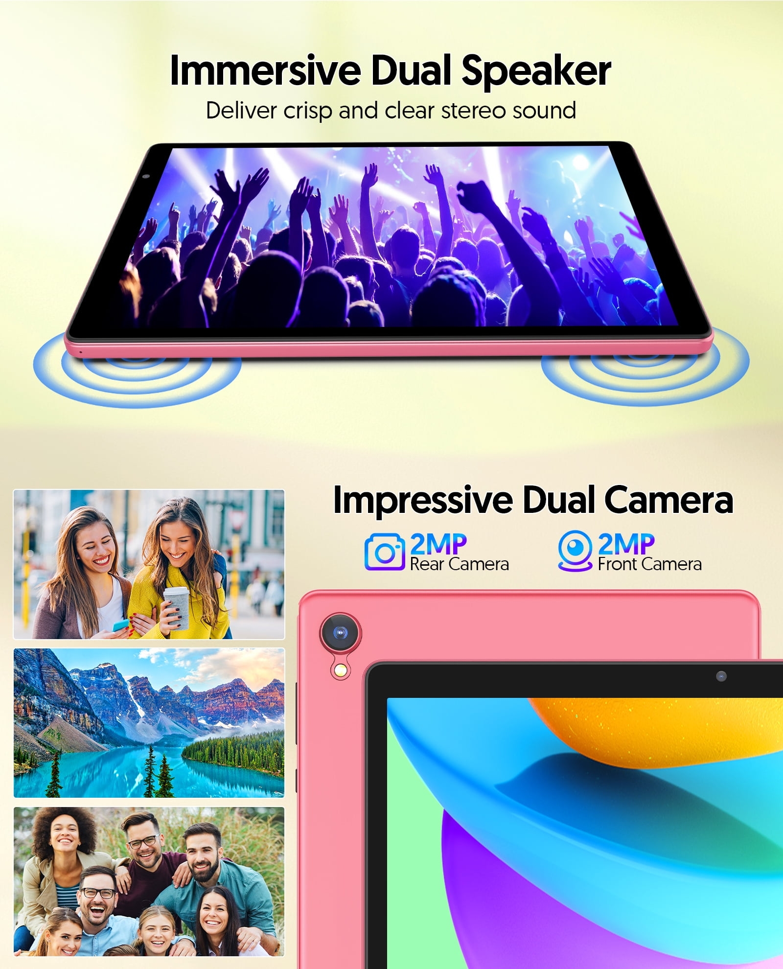 - HD Eye Protection Display: 10 in HD tablet equipped with high resolutionof 10 inch 1280×800 IPS display. Sizing up to 10 inches, you get more space, best choice for movie and video viewing and site browsing.It has dual cameras with 2MP on the rear and 2MP on the front for taking amazing photos and video chatting.