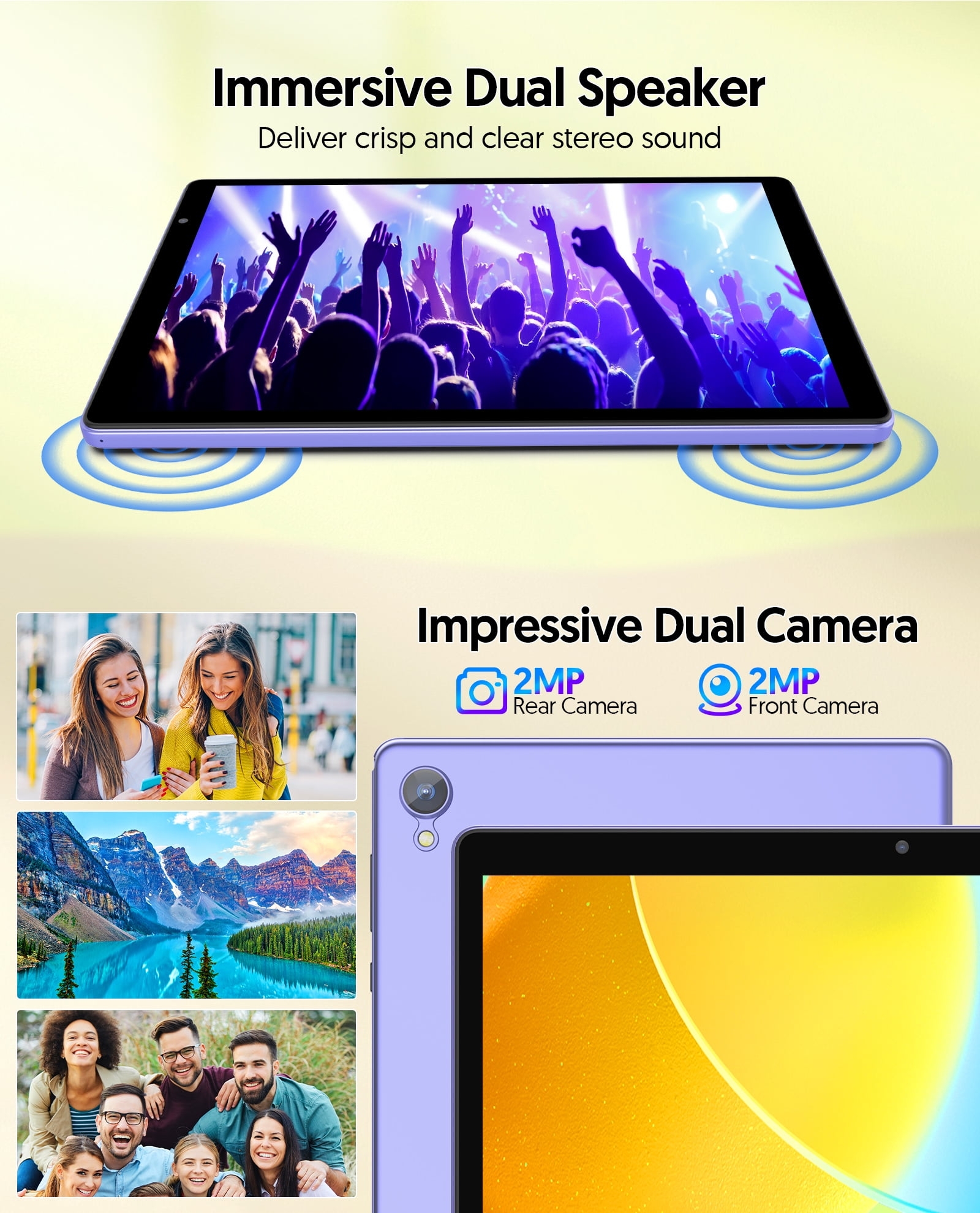 - Android 14 Tablet:10 inch tablet loaded with Android 14,features a high performance quad-core processor,delivering quick app launches,making your app run smoother. Perfect for working, reading, studying and entertainment.