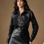 Anewsta Elegant PU Floral Embroidered Button-Up Shirt For Women, Suitable For Fall, Winter, New Year, Chic, Stylish, Christmas, Going Out
