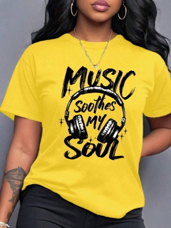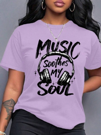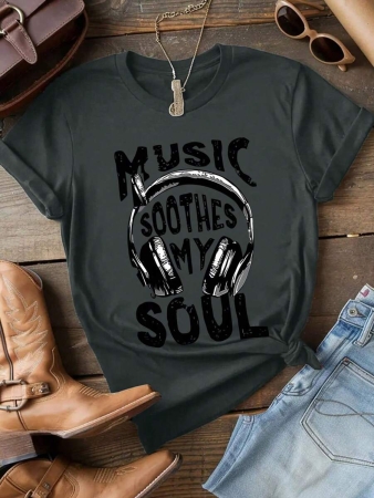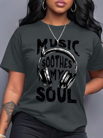 Chiquease ‘Music Soothes My Soul’ Headset Graphic Tees Letter Slogan T-Shirt, Round Neck Short Sleeved Women Tops