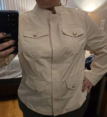 The jacket is cute and fits well. The description did not say it has NO stretch. I still like it and would buy again.