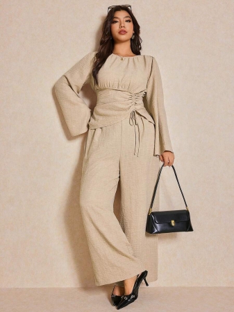 Elaquor Plus Size Elegant Drawstring Detail Top And Pants 2 Pieces Set, Autumn/Winter Dresses For Women