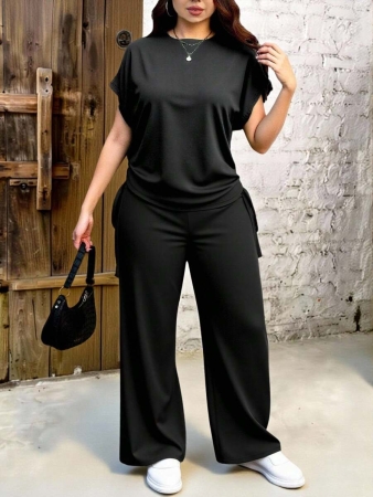 3 reviews for EMERY ROSE 2pcs Navy Blue Solid Color Plus Size Women Casual Set, Suitable For Summer