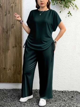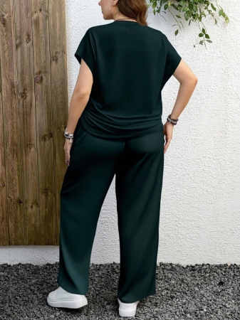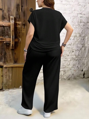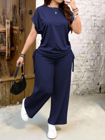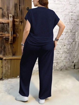 EMERY ROSE 2pcs Navy Blue Solid Color Plus Size Women Casual Set, Suitable For Summer