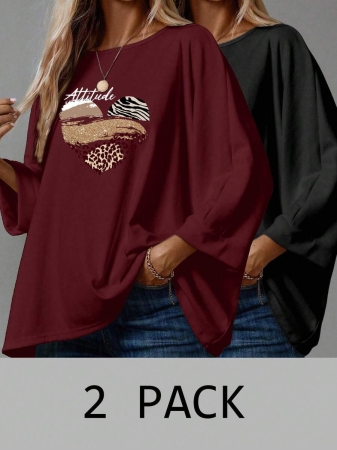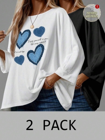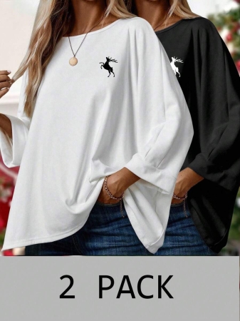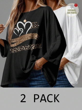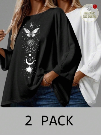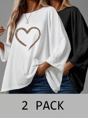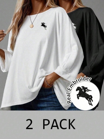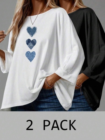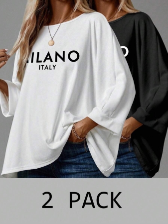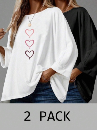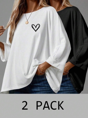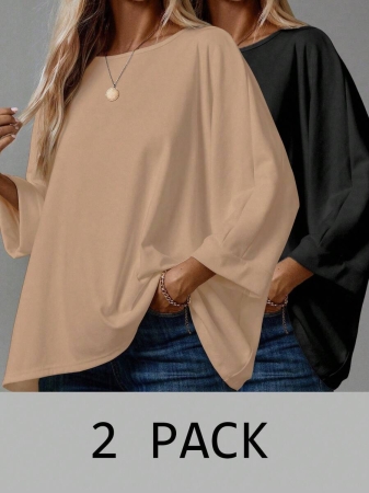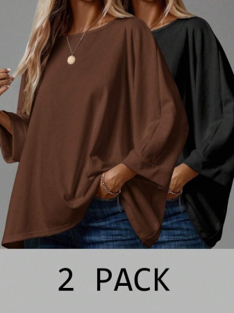 EMERY ROSE 2pcs/Set Women’s Casual Minimalist Basic T-Shirt, Suitable For Autumn/Winter Over Sized Tshirts Women Shirt Pack Women 2 Pack Tops,Fall