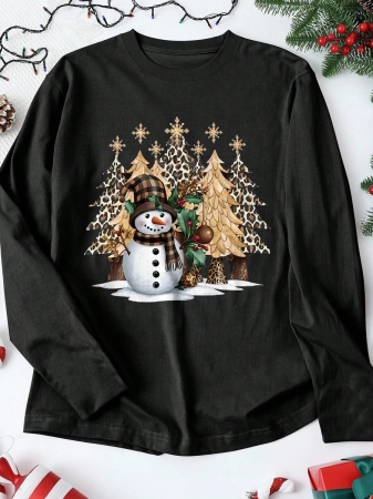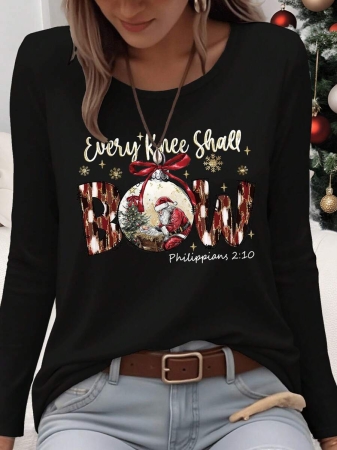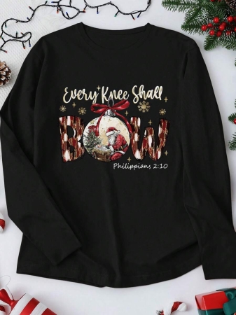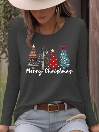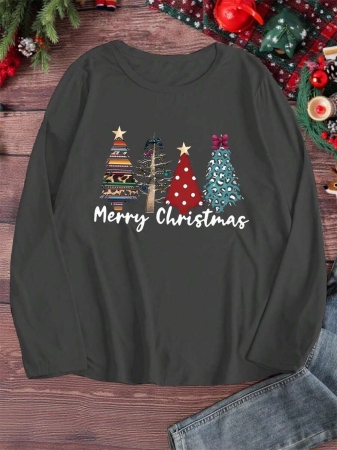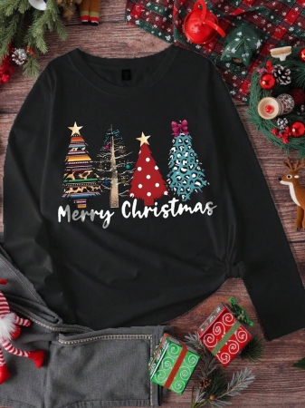 EMERY ROSE Christmas Letter Slogan & Christmas Tree Pattern Round Neck Long Sleeve Fashionable Plus Size T-Shirt