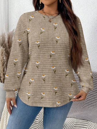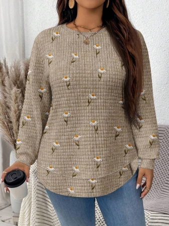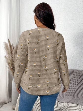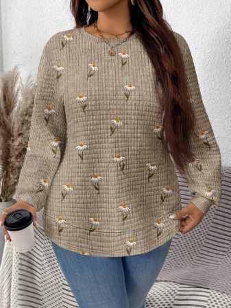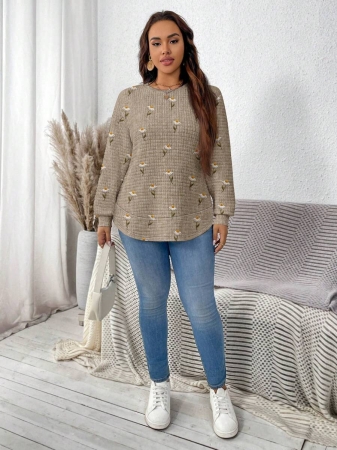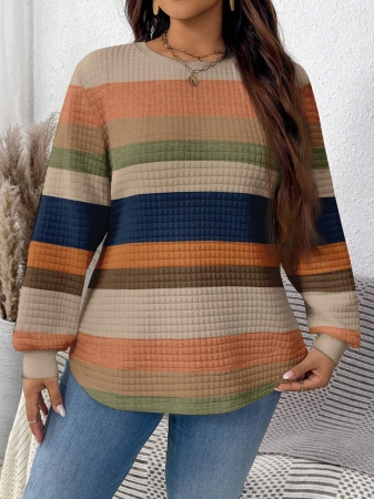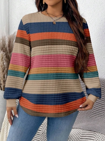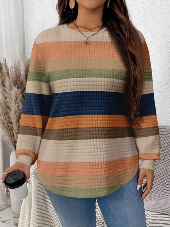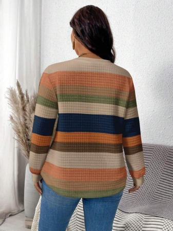 EMERY ROSE Plus Size Women Casual Colorful Striped Print Loose Fit Crew Neck Long Sleeve Sweatshirt, Waffle Texture, Suitable For Autumn/Winter Fall Winter Fall Tops Women Pullover For Women Striped Sweater Striped Long Sleeve