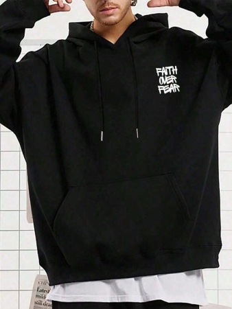 Faith Over Fear, Letter Print Pocket Hoodie, Men’s Casual Long-Sleeve Drawstring Style, Autumn & Winter New-Unisex Loose-Fit Hooded Sweatshirt-K88
