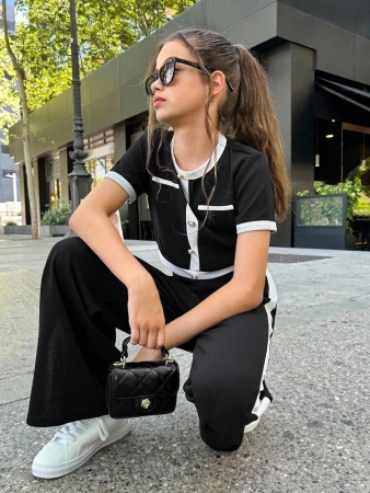 Firerie Kids Firerie Kids Tween Girl Casual & Formal Elegant Back To School Black & White Contrast Pearl Button Top & Straight Leg Color Block Pants