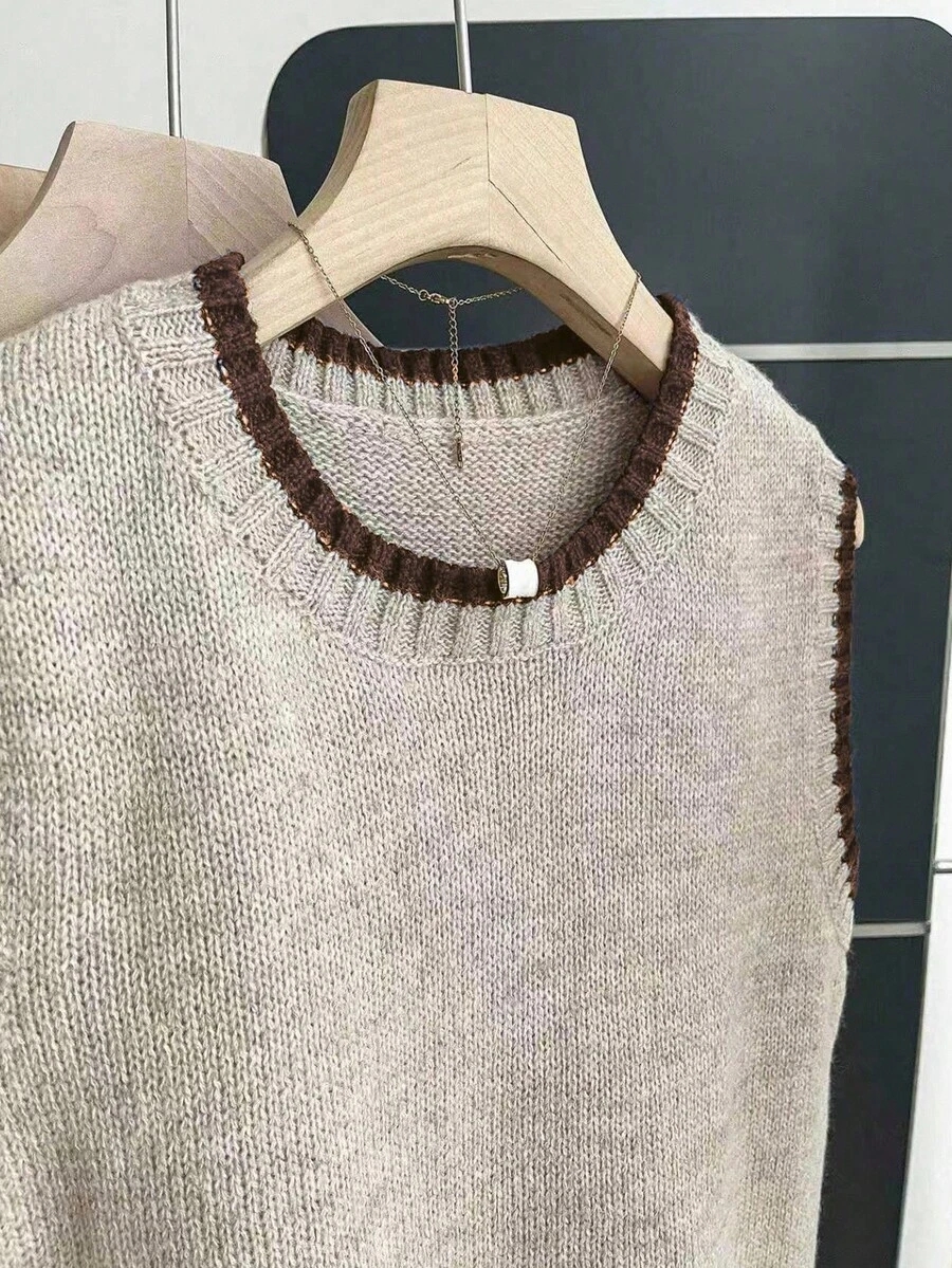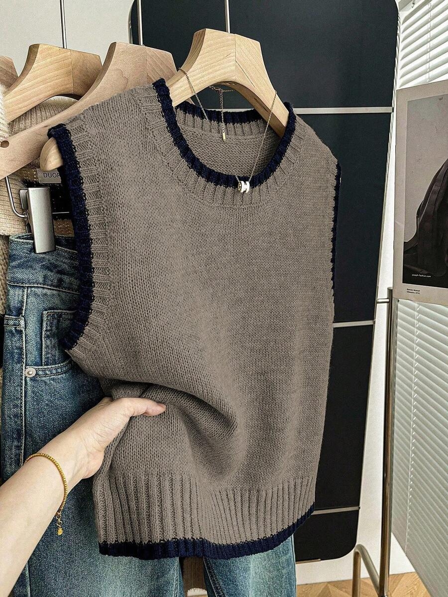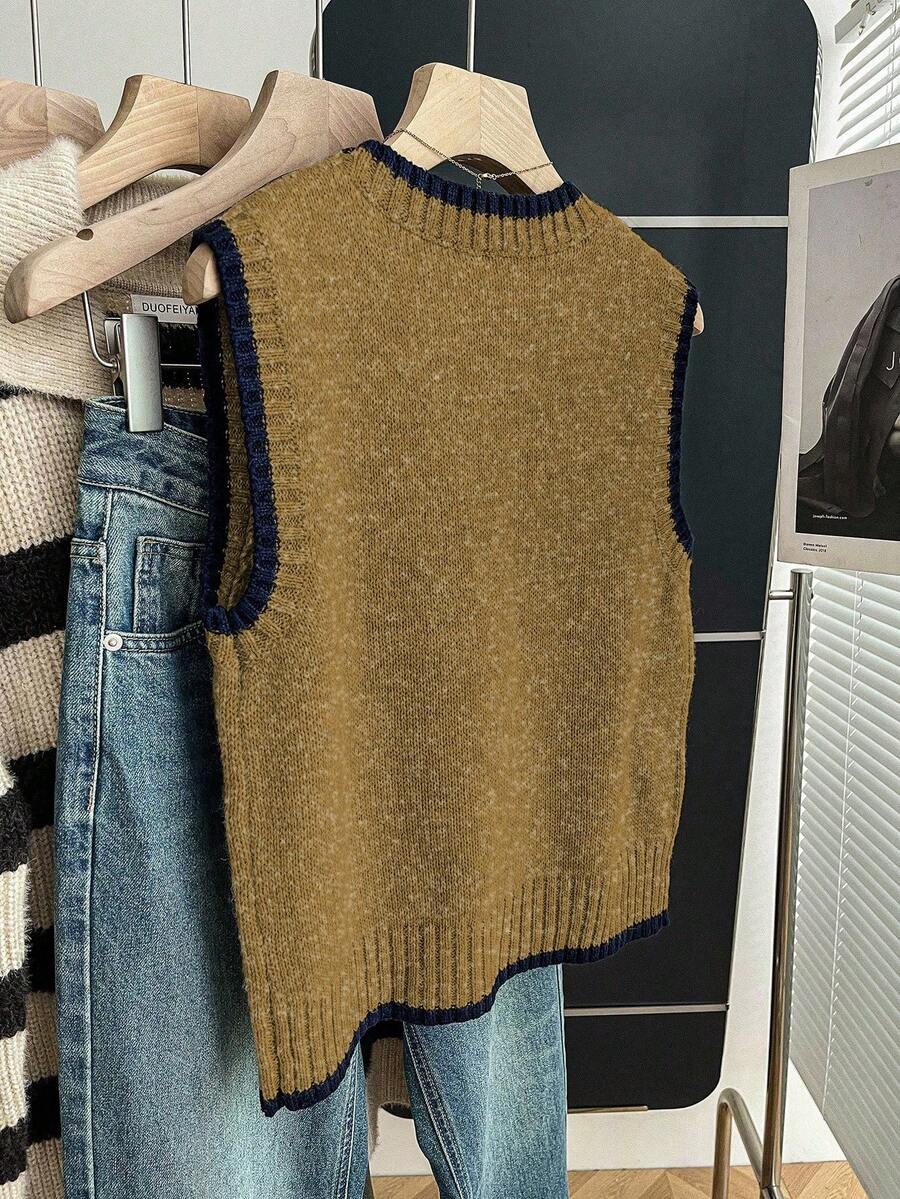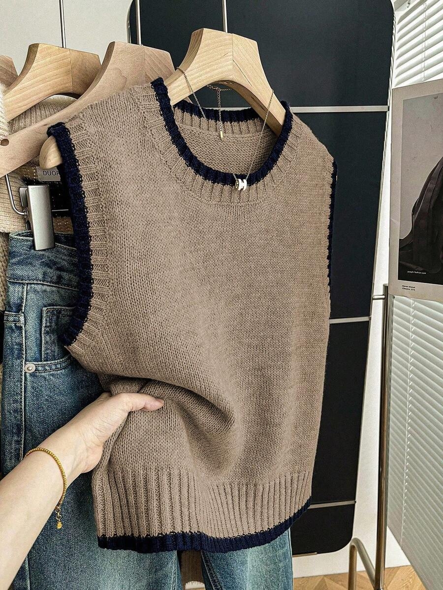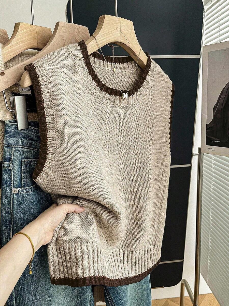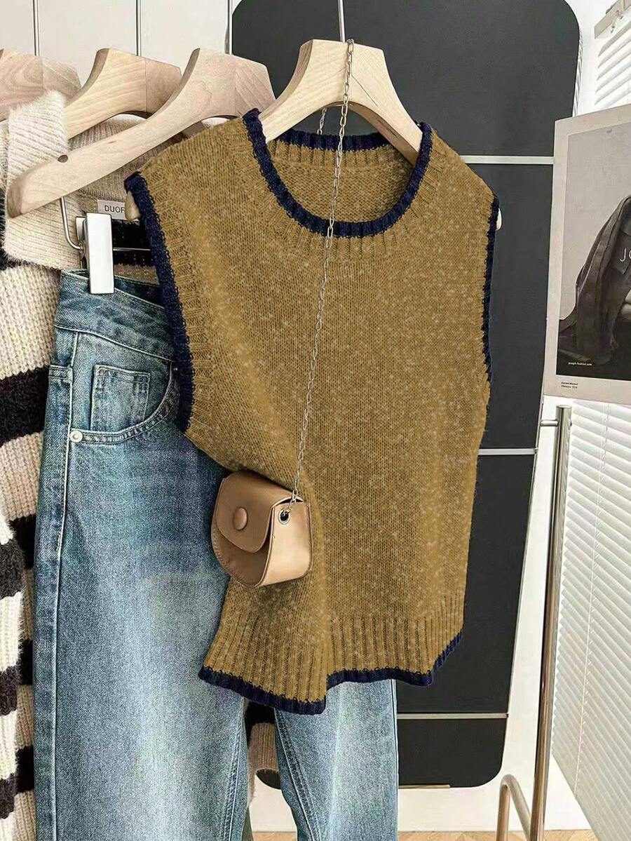 Franclia Back To School Casual Style Loose Round Neck Sleeveless Woolen Woven Contrasting Color Trimmed Khaki Autumn And Winter Women’s Knitted Top Fall Clothes For Women Going Out Tops Women