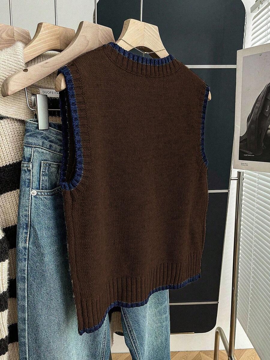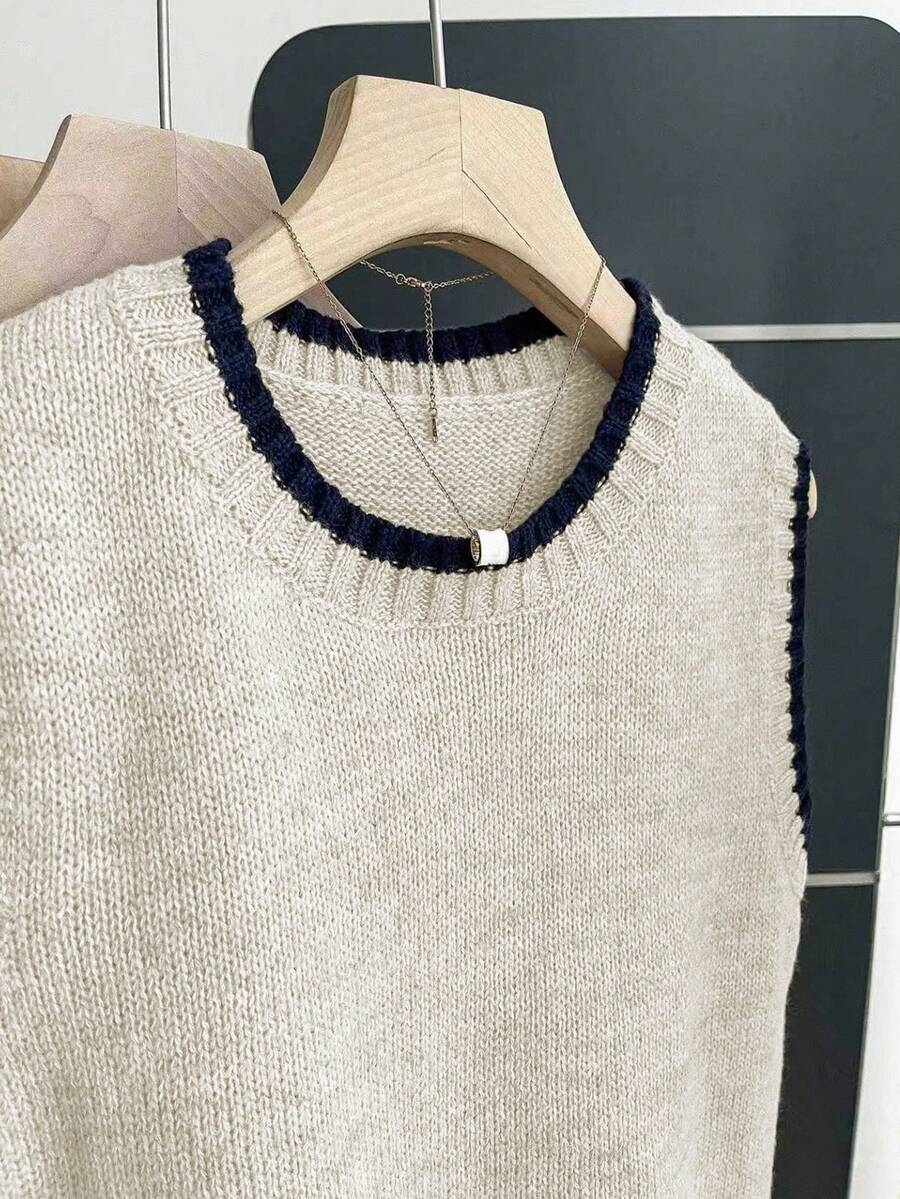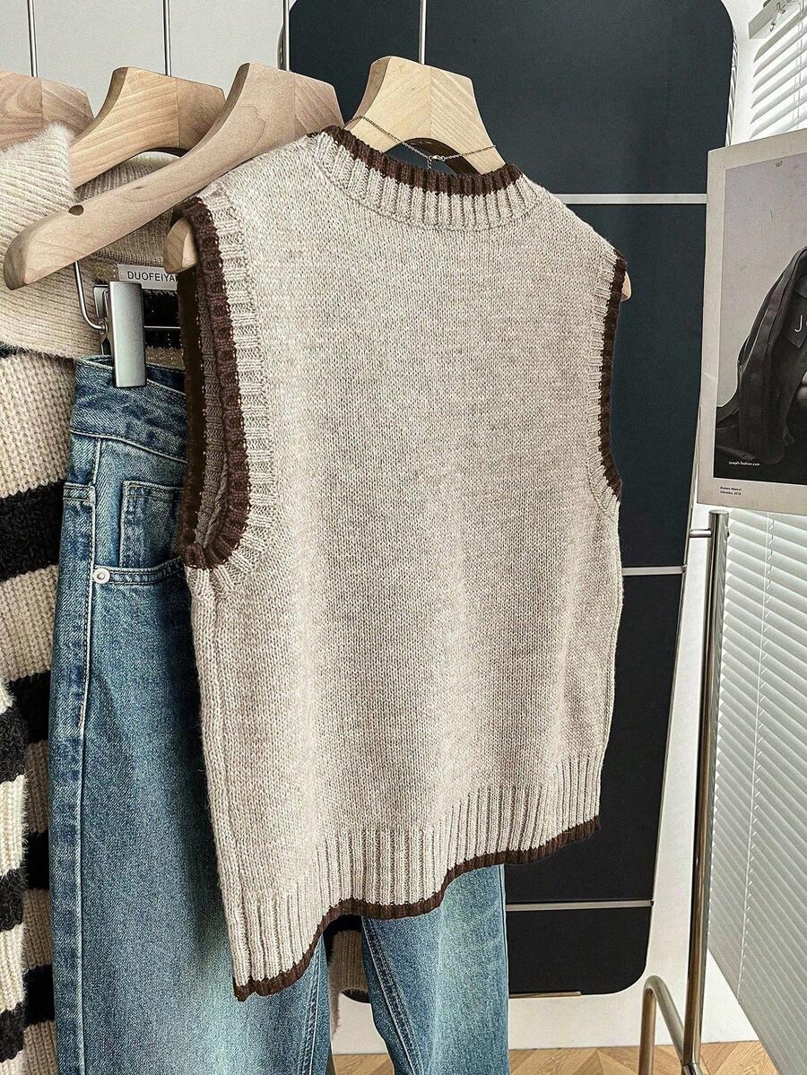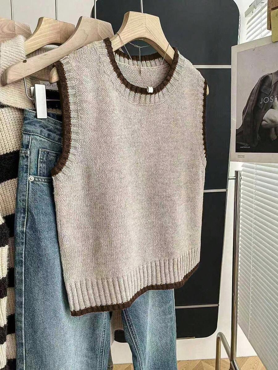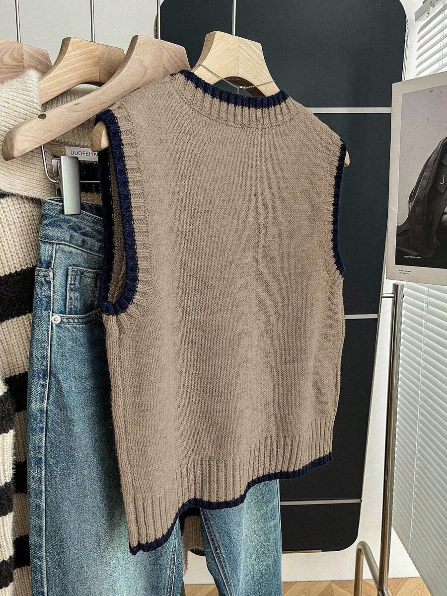 Franclia Back To School Casual Style Loose Round Neck Sleeveless Woolen Woven Contrasting Color Trimmed Khaki Autumn And Winter Women’s Knitted Top Fall Clothes For Women Going Out Tops Women