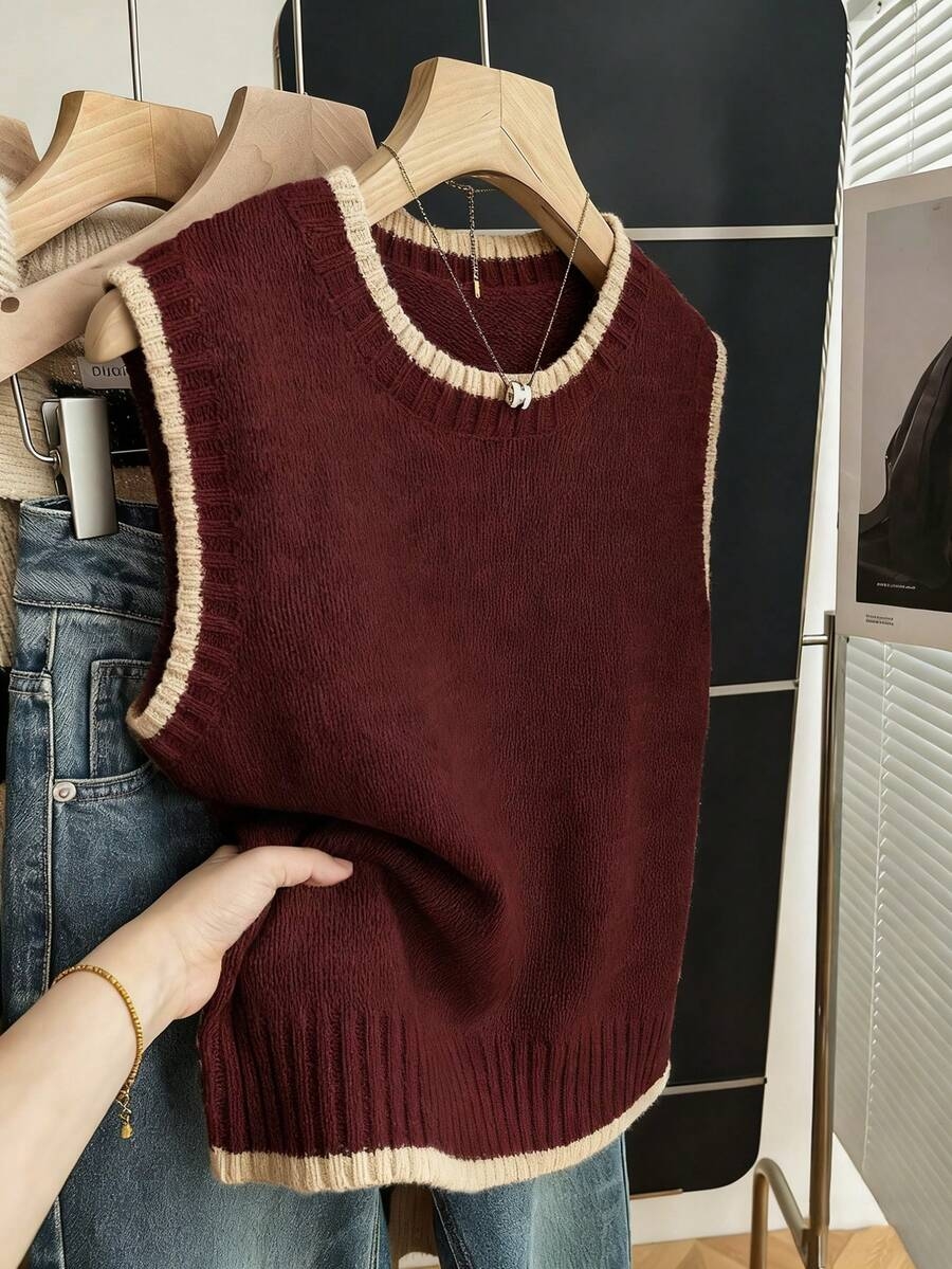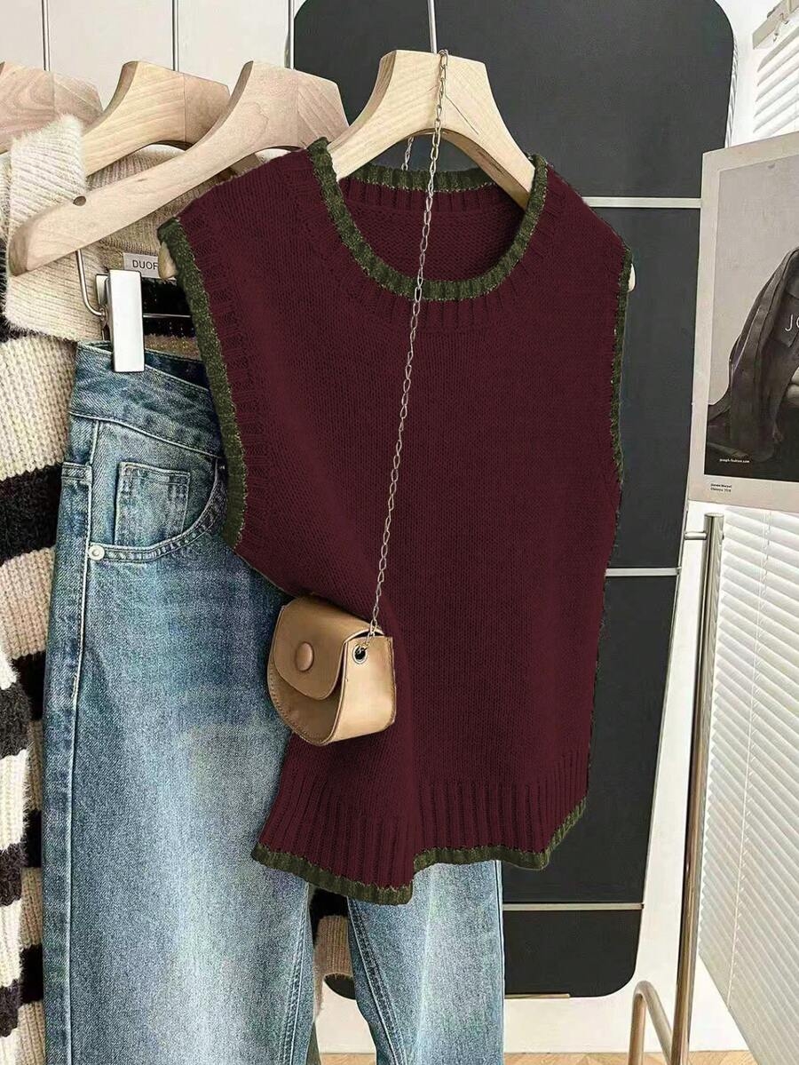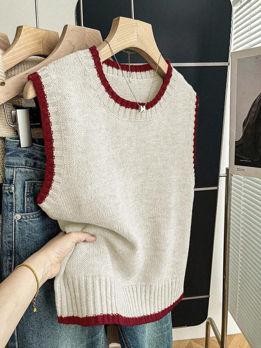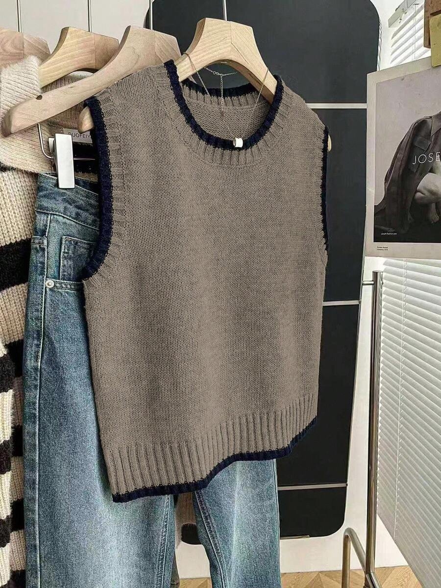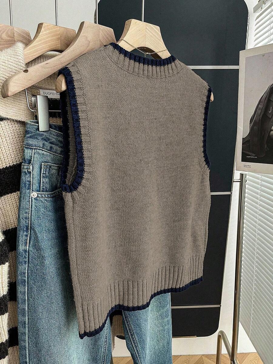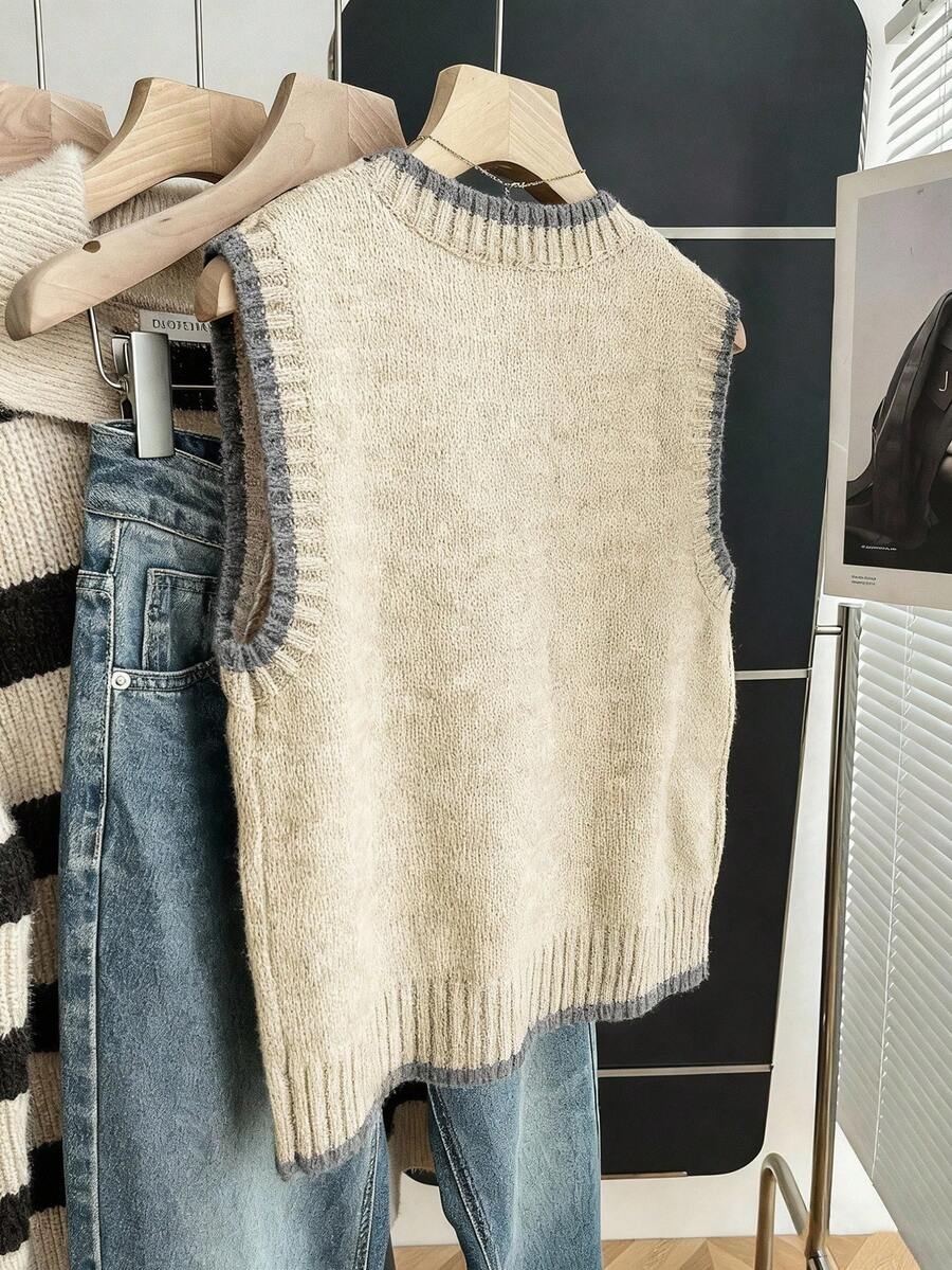 Franclia Back To School Casual Style Loose Round Neck Sleeveless Woolen Woven Contrasting Color Trimmed Khaki Autumn And Winter Women’s Knitted Top Fall Clothes For Women Going Out Tops Women