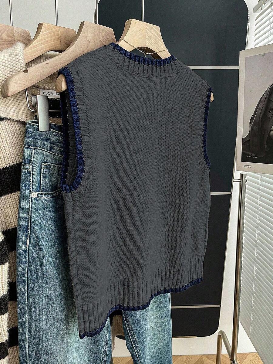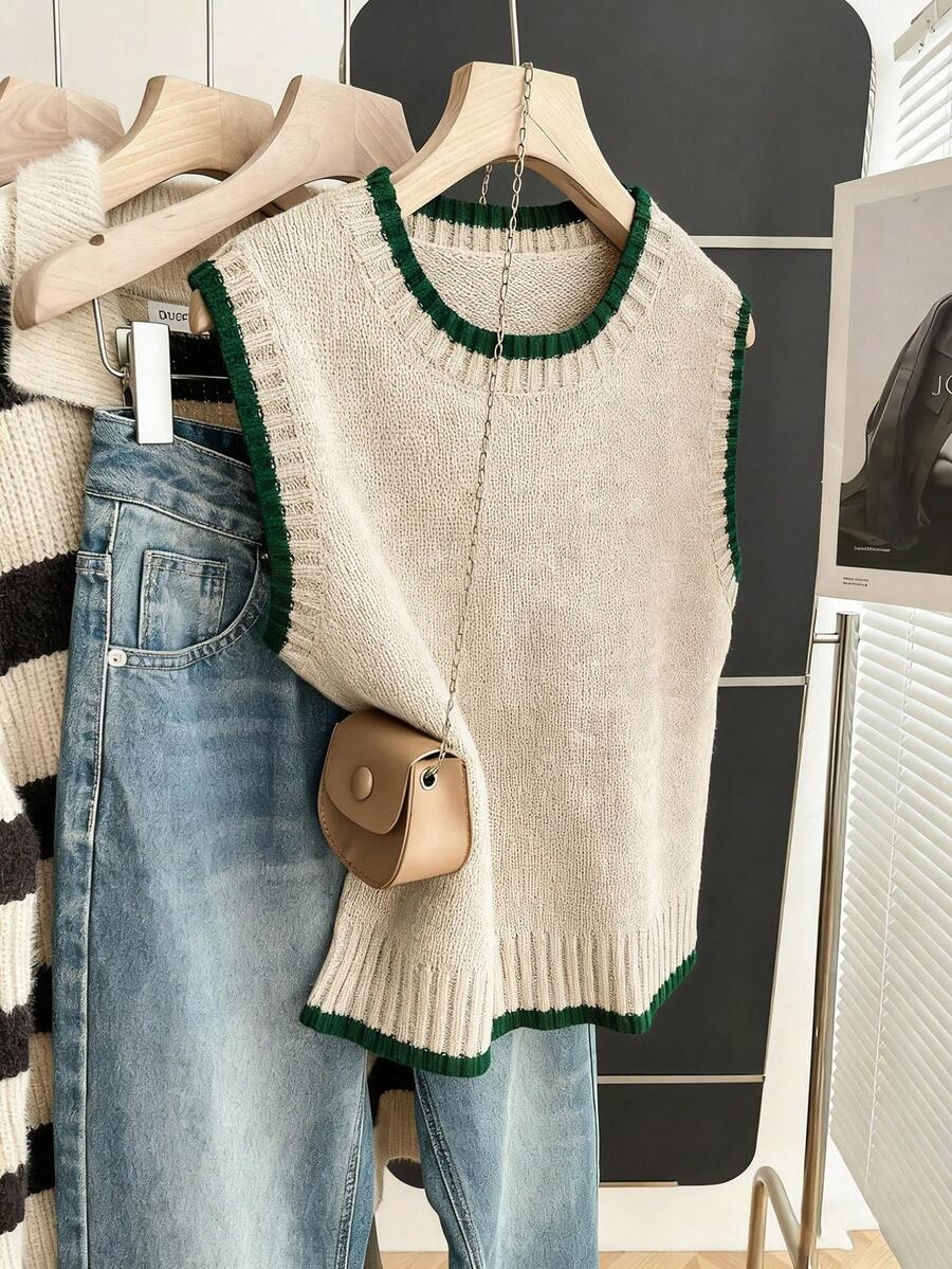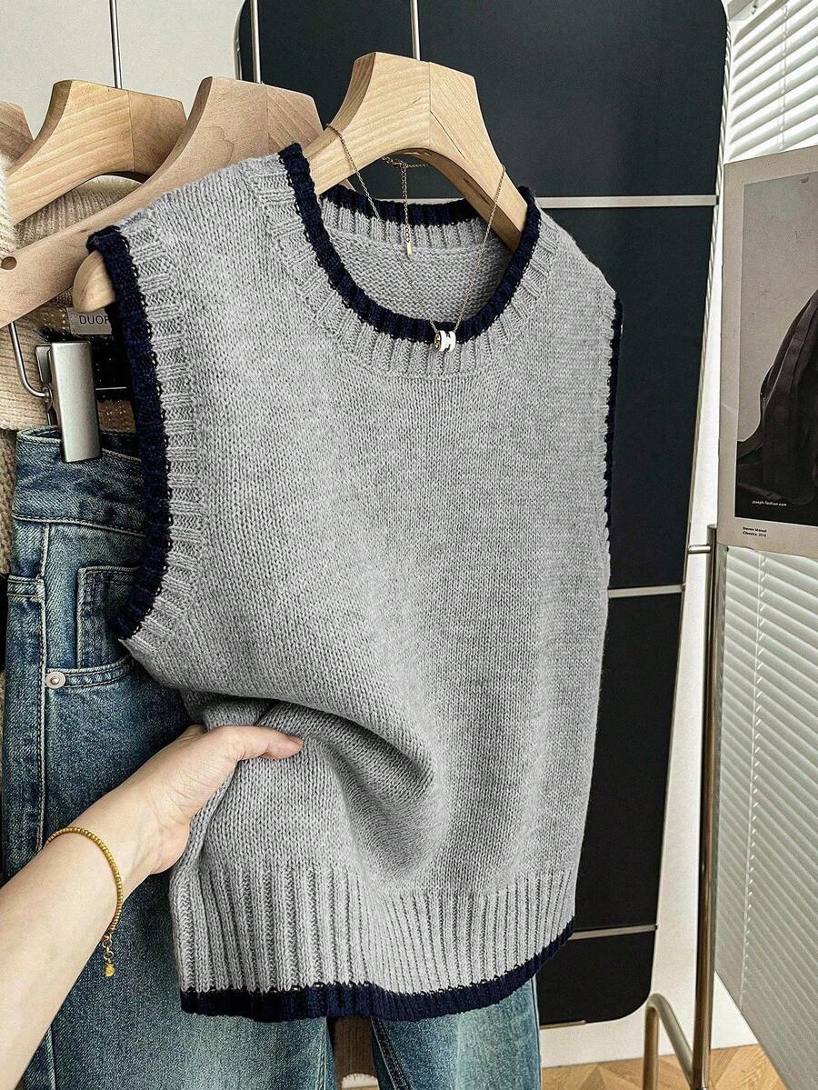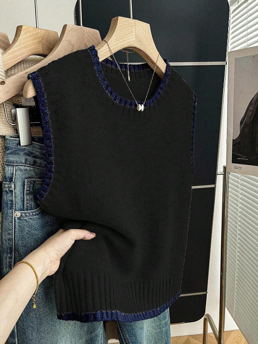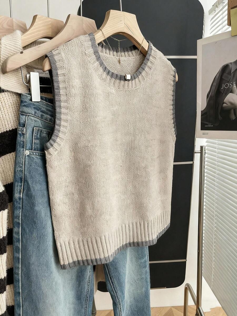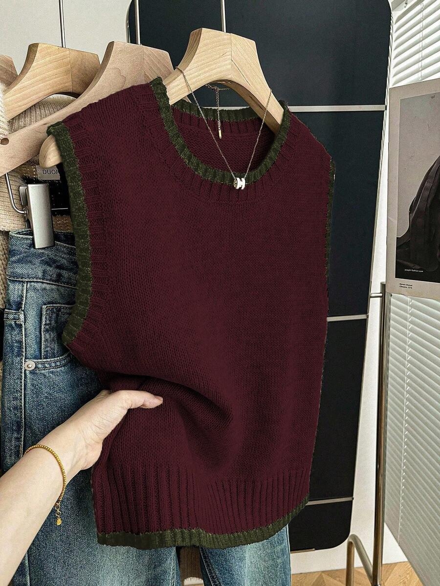 Franclia Back To School Casual Style Loose Round Neck Sleeveless Woolen Woven Contrasting Color Trimmed Khaki Autumn And Winter Women’s Knitted Top Fall Clothes For Women Going Out Tops Women