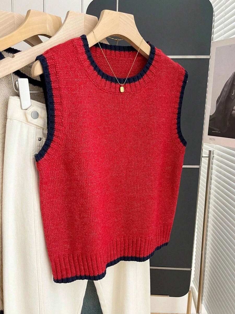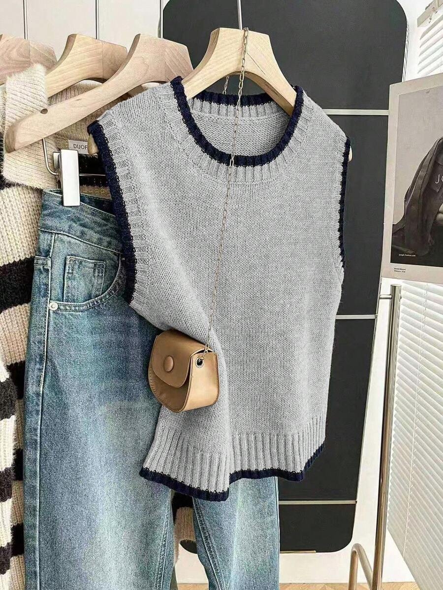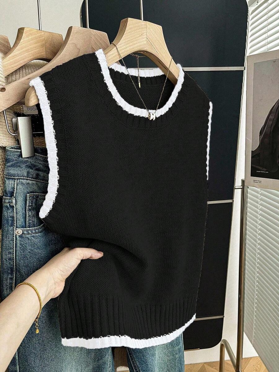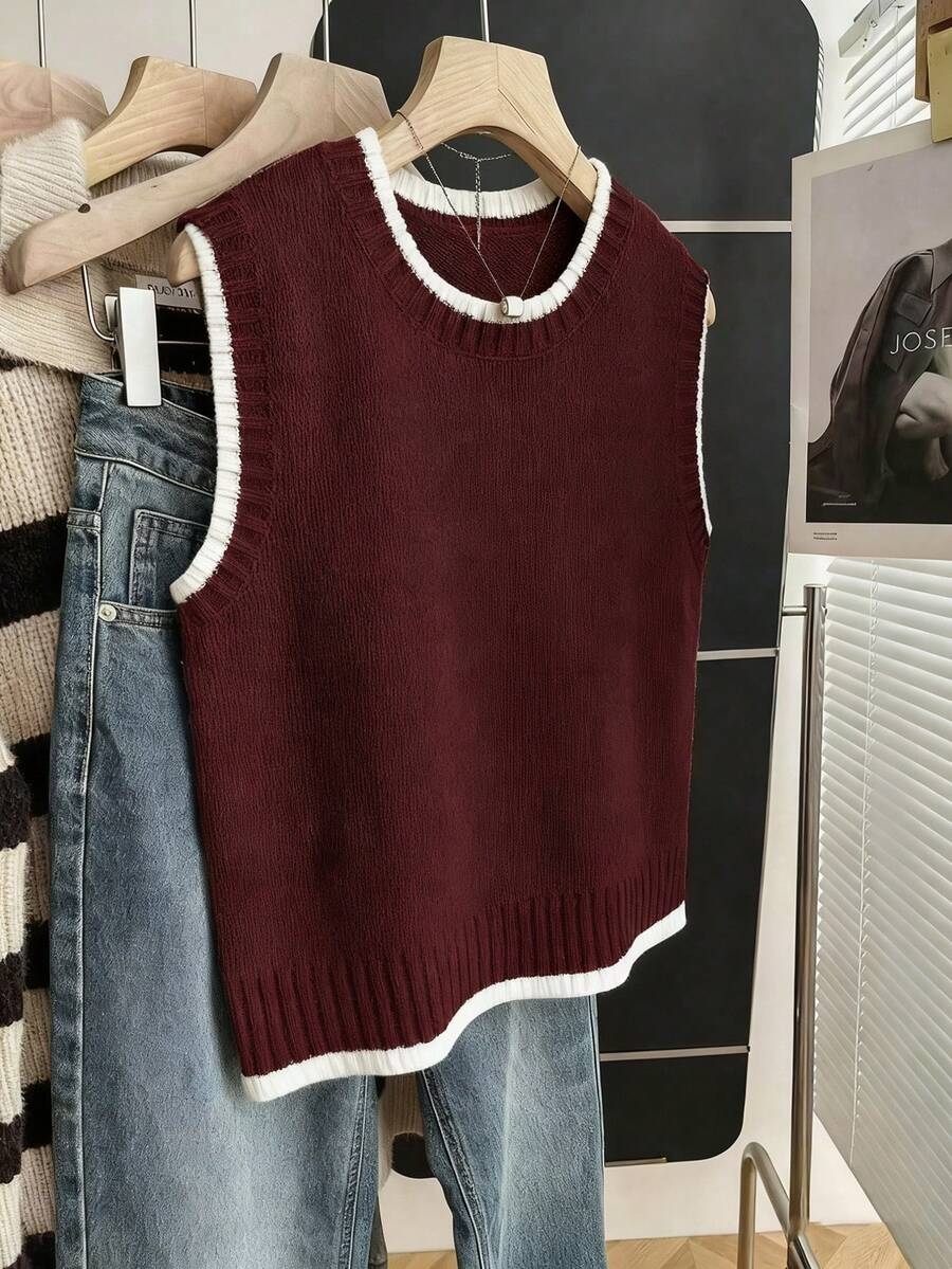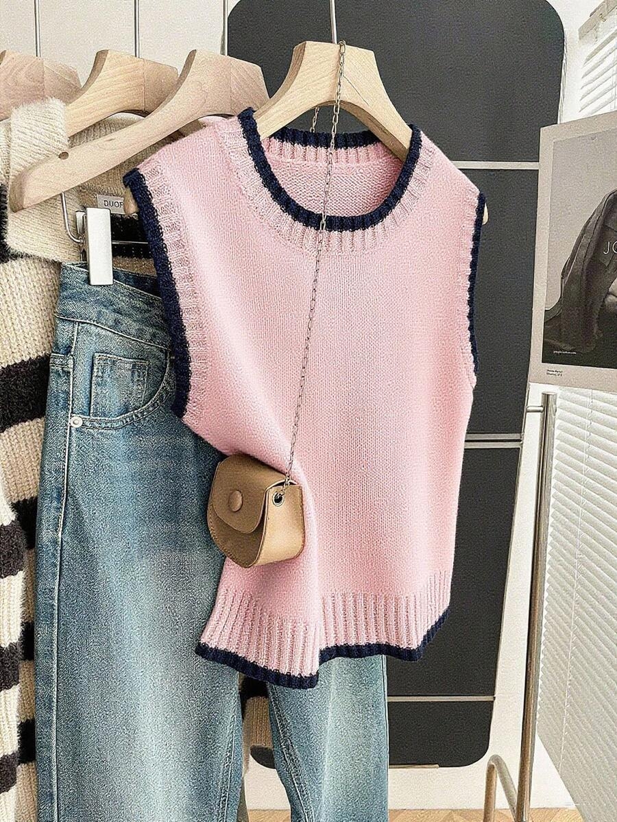 Franclia Back To School Casual Style Loose Round Neck Sleeveless Woolen Woven Contrasting Color Trimmed Khaki Autumn And Winter Women’s Knitted Top Fall Clothes For Women Going Out Tops Women