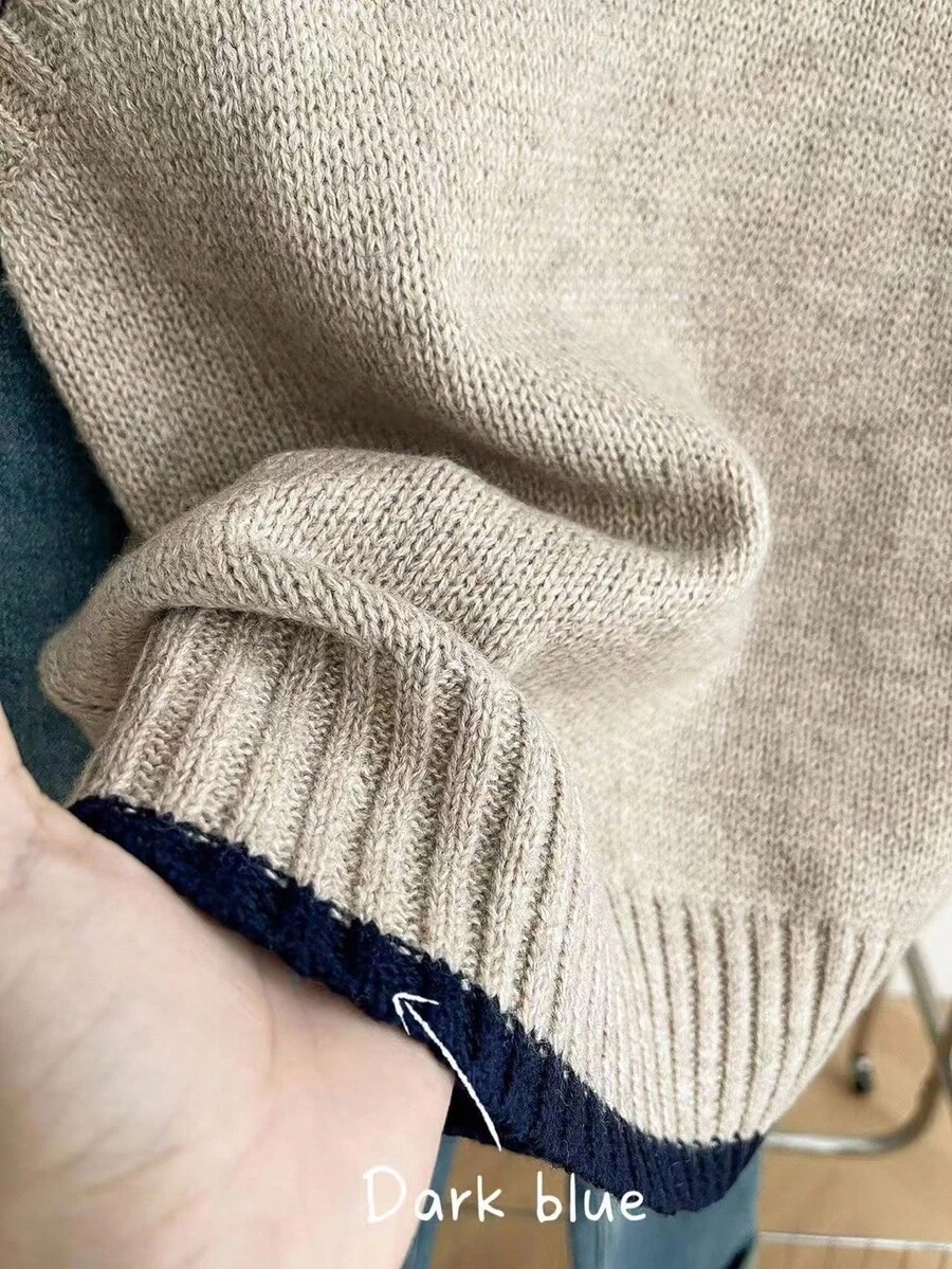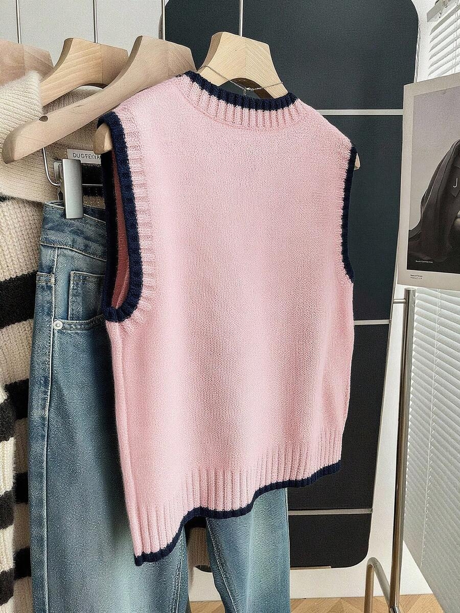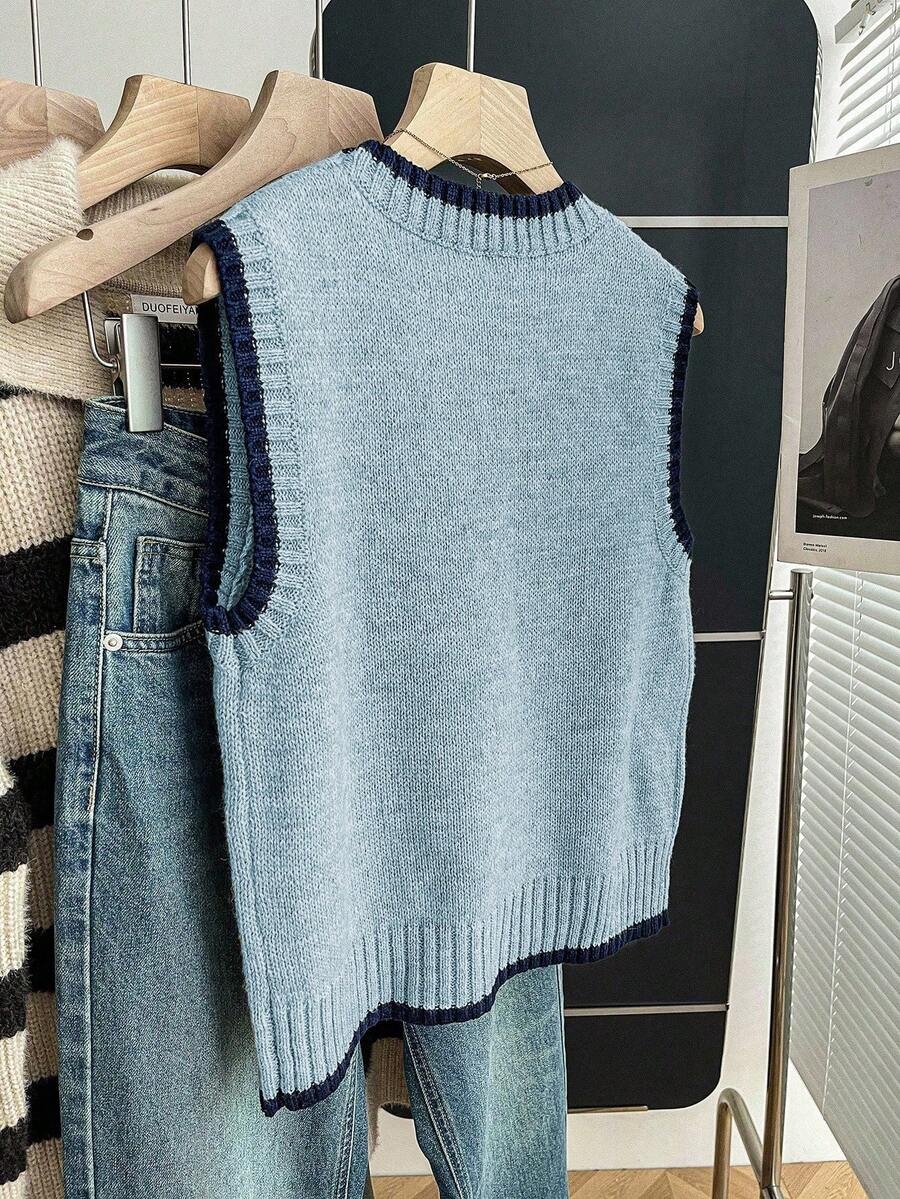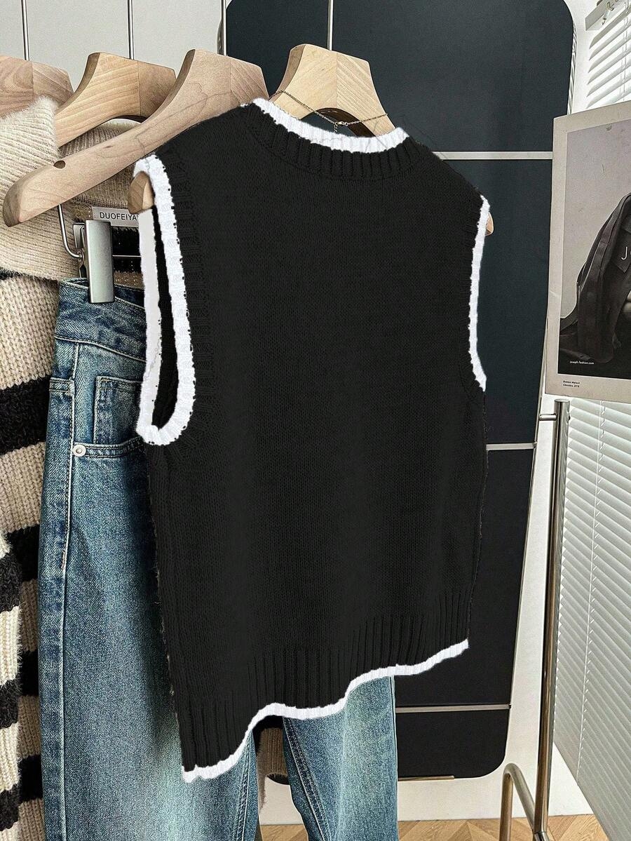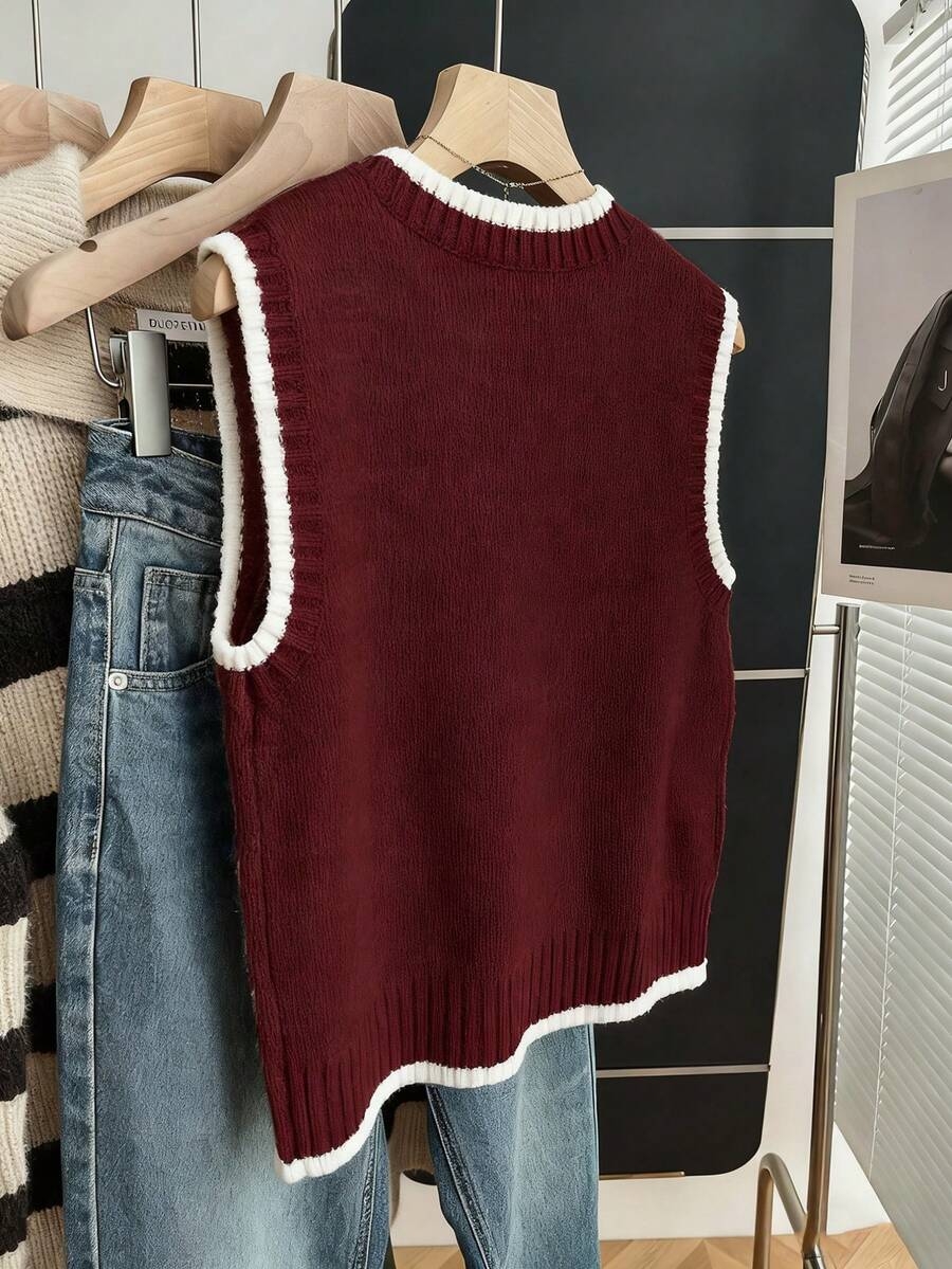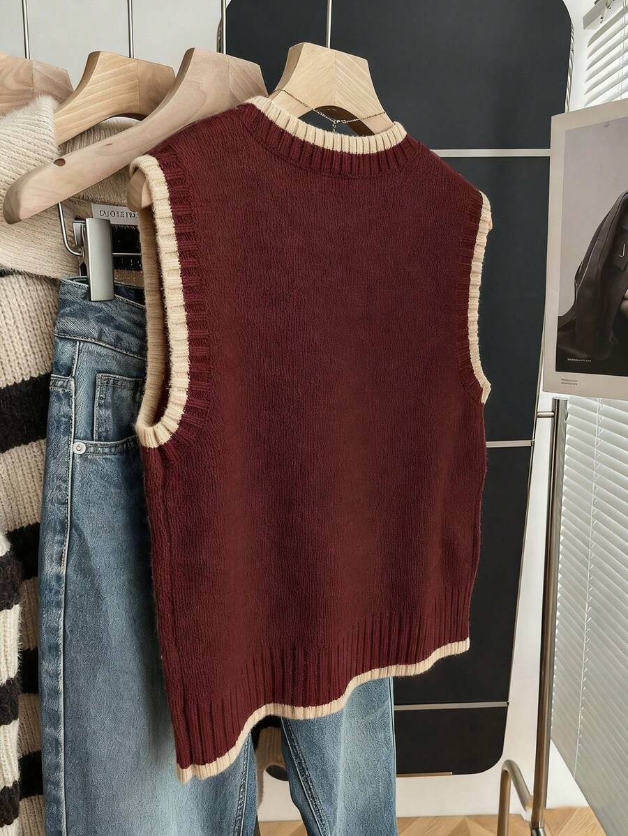 Franclia Back To School Casual Style Loose Round Neck Sleeveless Woolen Woven Contrasting Color Trimmed Khaki Autumn And Winter Women’s Knitted Top Fall Clothes For Women Going Out Tops Women