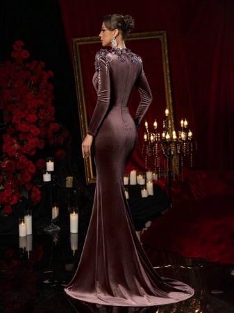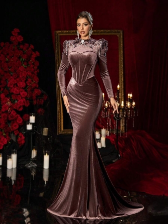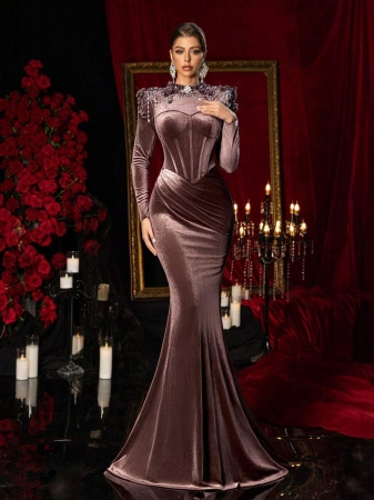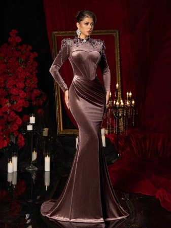 Glamrae Elegant Luxury Classic Square Shoulder Stand Collar Handcrafted Crystal Embroidery Herringbone Decor Design Ruched Hip Mermaid Hem Formal Gown, Business Attire, Guest Dress