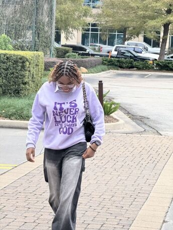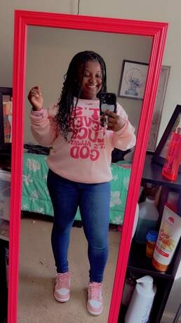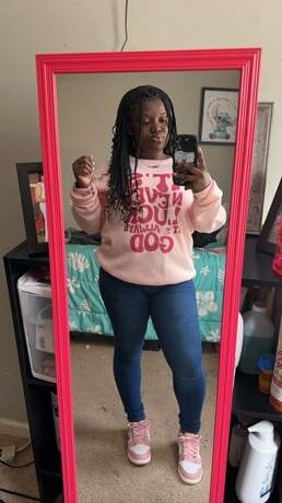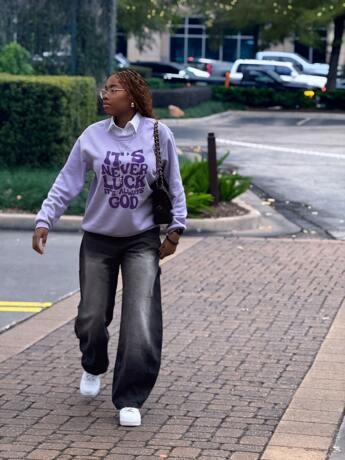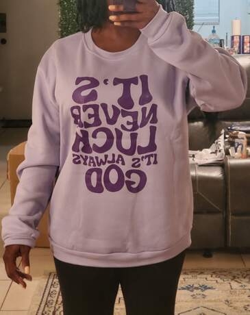 love the message bc its ALWAYS GOD! fits big. shipping came quick. the color in person is lighter like a light lavender color. please like my comment in broke yall!🙏🏾