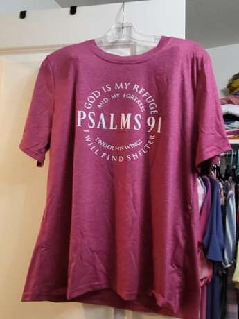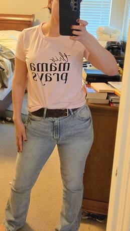 I absolutely love this tee! The material is so soft. The color is bright! Looks exactly like the picture. And this Mama definitely prays!