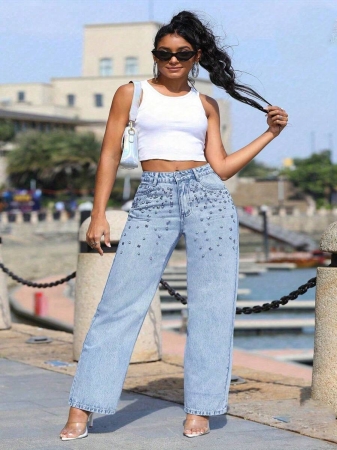 Large Size Women’s Sparkling Diamond String Y2K Street Style Loose Straight Leg Pants Suitable For Date Evening Wear, Outdoor Wear, Casual Multi-Functional Jeans