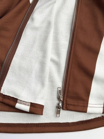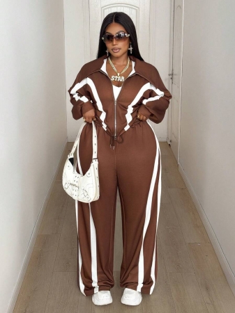 Maweii 2pcs/Set Women Plus Size Casual Outfit, Striped Print Splicing Collared Sweatshirt Jacket And Loose Pocket Pants, Fashionable Streetwear Commuter Suit, Autumn/Winter