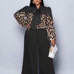 Maweii Plus Size Women’s Fashion Leopard Pattern Positioning Print Bow Long-Sleeved Shirt And Loose Solid Long Wide-Leg Pants Two Pieces Suit, Simple Temperament Two Pieces Suit, Workplace Commuting Old Money Style, Suitable For Daily Casual Wear, Picnics, Dates, Music Festivals, Valentine’s Day, Graduation Season, Parties, Etc. “Women’s Autumn Clothing, Fall, Winter