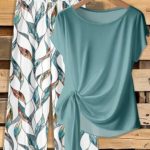 3 reviews for Mellowie 2pcs Women Casual Minimalist Green Bow Tie Shirt & Loose Straight Geometric Print Pants Set, Suitable For Early Autumn