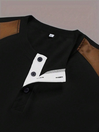 Men’s Front Button Waffle Knit Patchwork Contrast Color Henley T-Shirt, Casual Outdoor, Fall