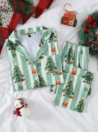 Merry Christmas Women Minimalist Fashion All-Over Christmas Tree Striped Comfortable Turndown Collar Cardigan Long Sleeve Top And Casual Pants 2 Pieces Pajama Set, Family Matching Christmas Pajamas Family, Fall Clothes