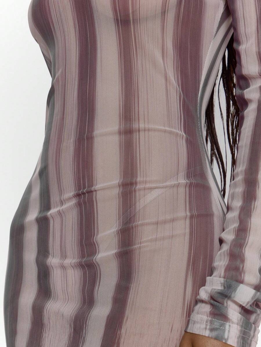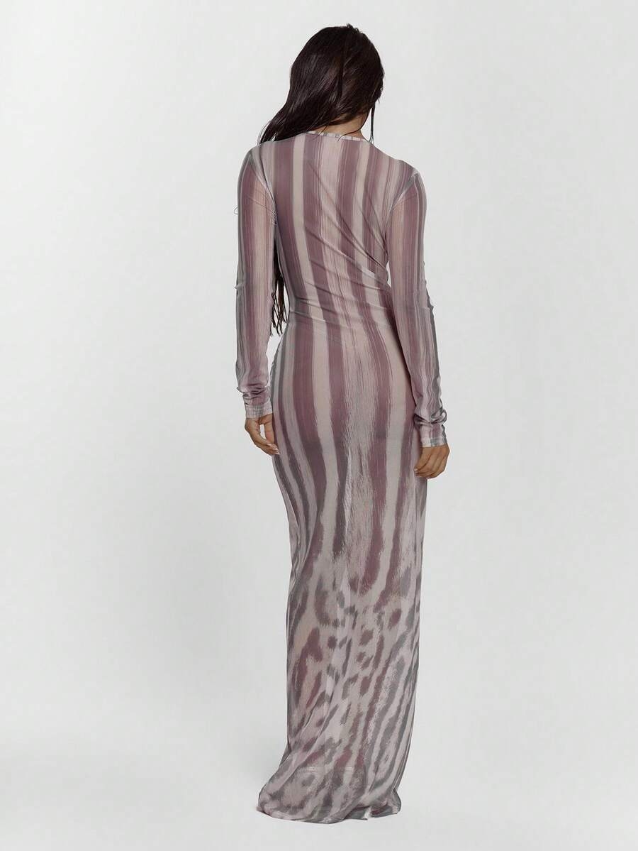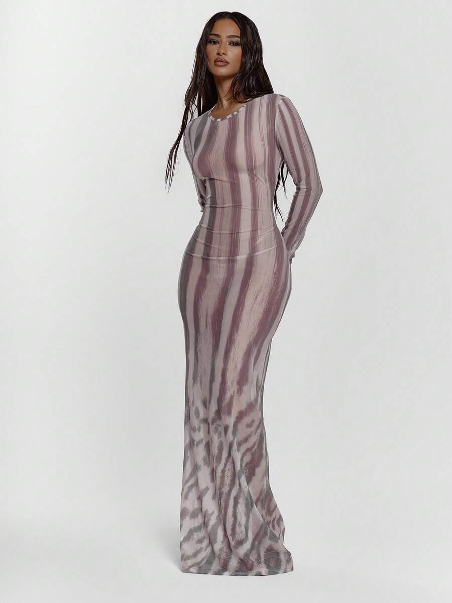 MUSERA Fitted Animal Printed Mesh Long Sleeve Crew Neck Maxi Dress Sexy Going Out Autumn Fall Night Out Winter Cute Streetwear Feraux
