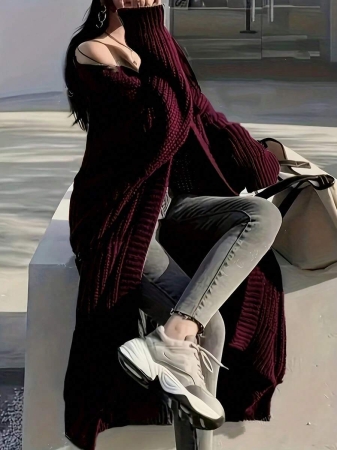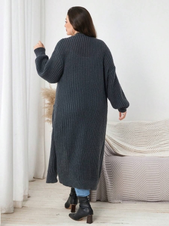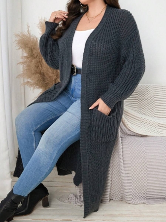 3 reviews for Plus Size Midi Cardigan With Pockets, Long Drop Shoulder Sleeves, Rib Knit Slit Hem, Soft Fabric