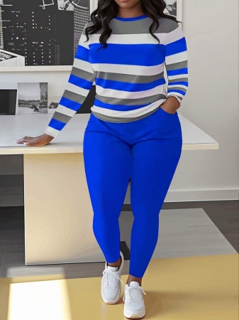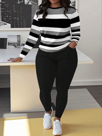 Plus Size Striped Long Sleeve Top And Solid Color Pants Set – Casual Polyester Blend With Pocket Detail, Medium Stretch Fabric, Round Neck Women’S Plus Size Outfit