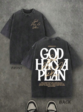 Retro Washed T-Shirt Double Sided Printed (230 Pure Cotton T-Shirt) ‘GOD HAS A PLAN’ Letter Print, Men’s T-Shirt, Men’s Casual, Comfortable, Fashionable T-Shirt, Street Style Cotton