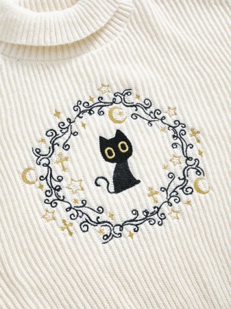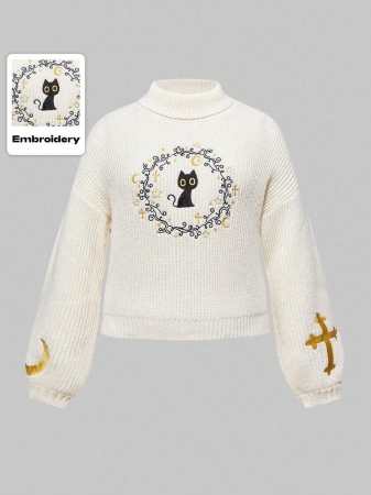 ROMWE Fairycore Plus Size Women Autumn/Winter Cat & Moon Embroidery Drop Shoulder Half-Turtleneck Sweater, Halloween Long Sleeve Pullover Sweater