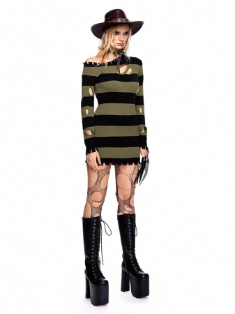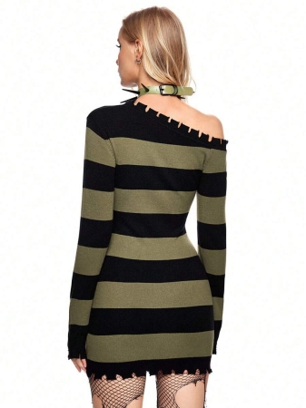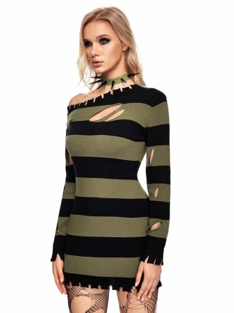 ROMWE Grunge Punk Women’s Long Sleeve Ripped Striped Pullover Sweater, Autumn & Winter