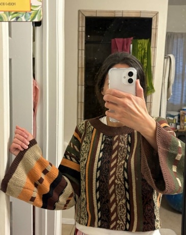 So cute! Great material, thick, nice details. Sleeve length is good. It’s a short sweater, but I’m high waisted and ok with shorter length tops. 113 lbs, 5,5” and the small is perfect. Colors look exactly as they were pictured.