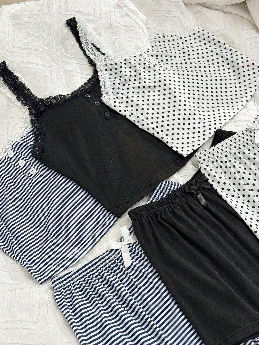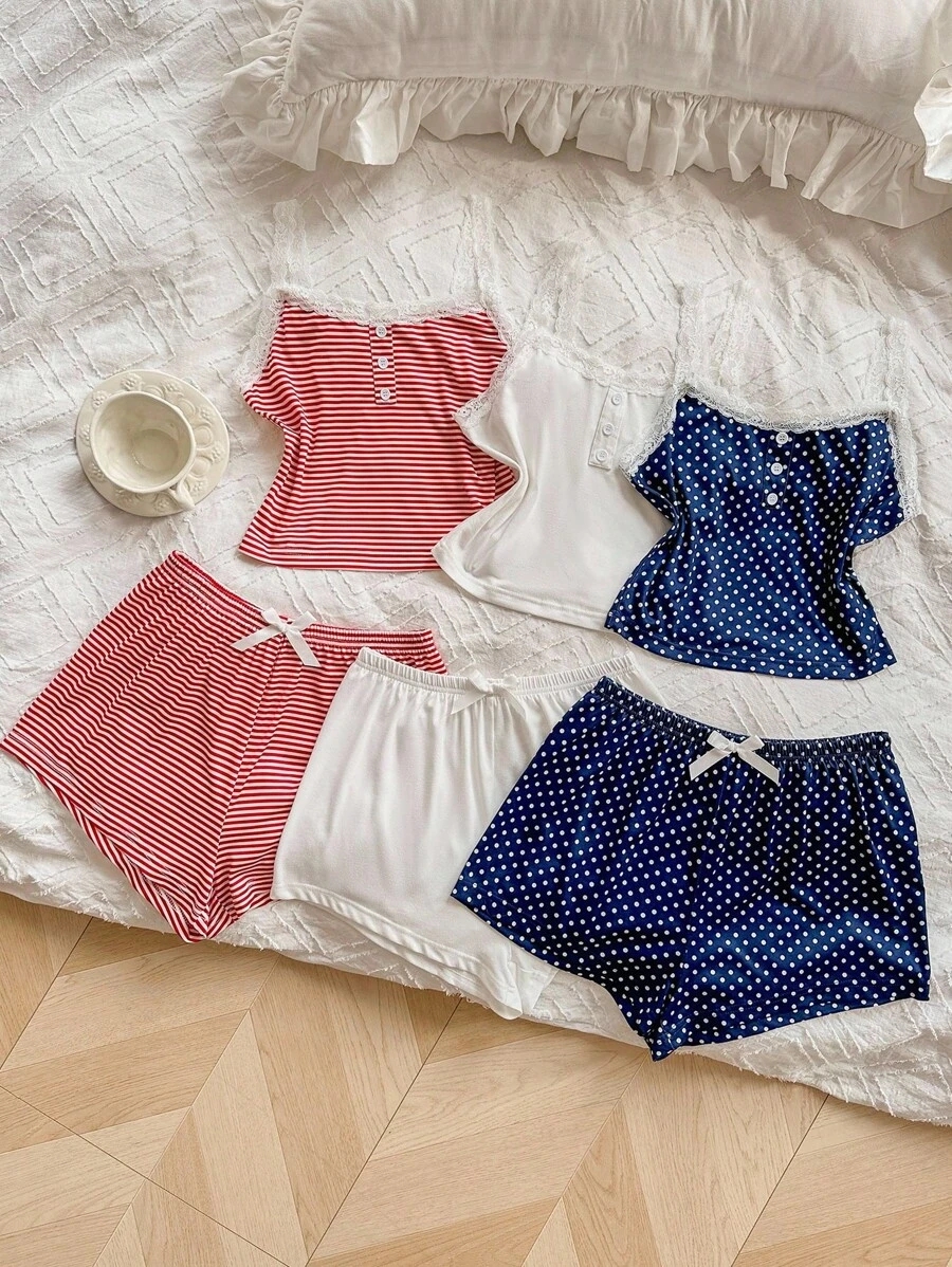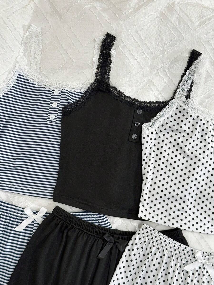 SHEIN 6pcs Women Casual Fitted False Placket Lace Patchwork Floral Print Camisole Shorts Pajama Set Bow TieĀ  Cozy And Elegant Details