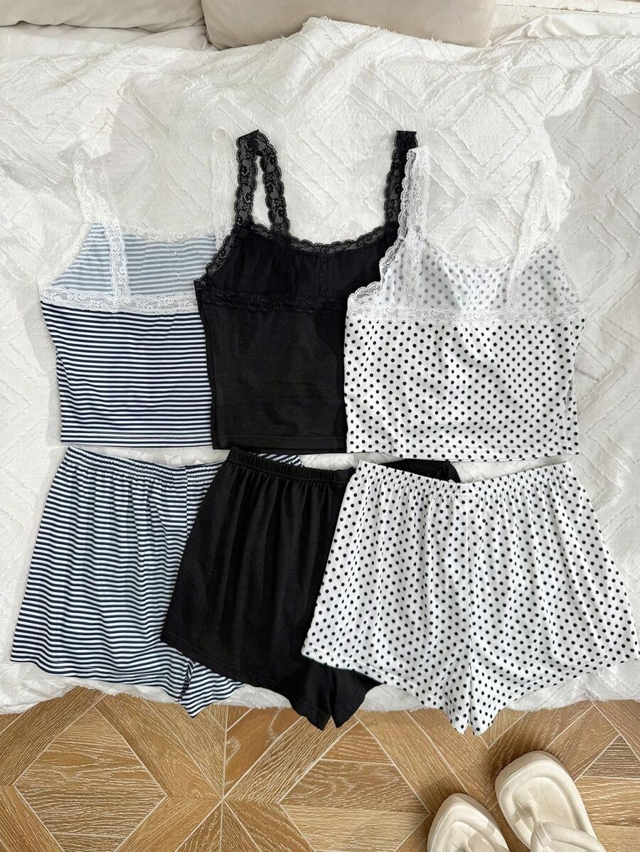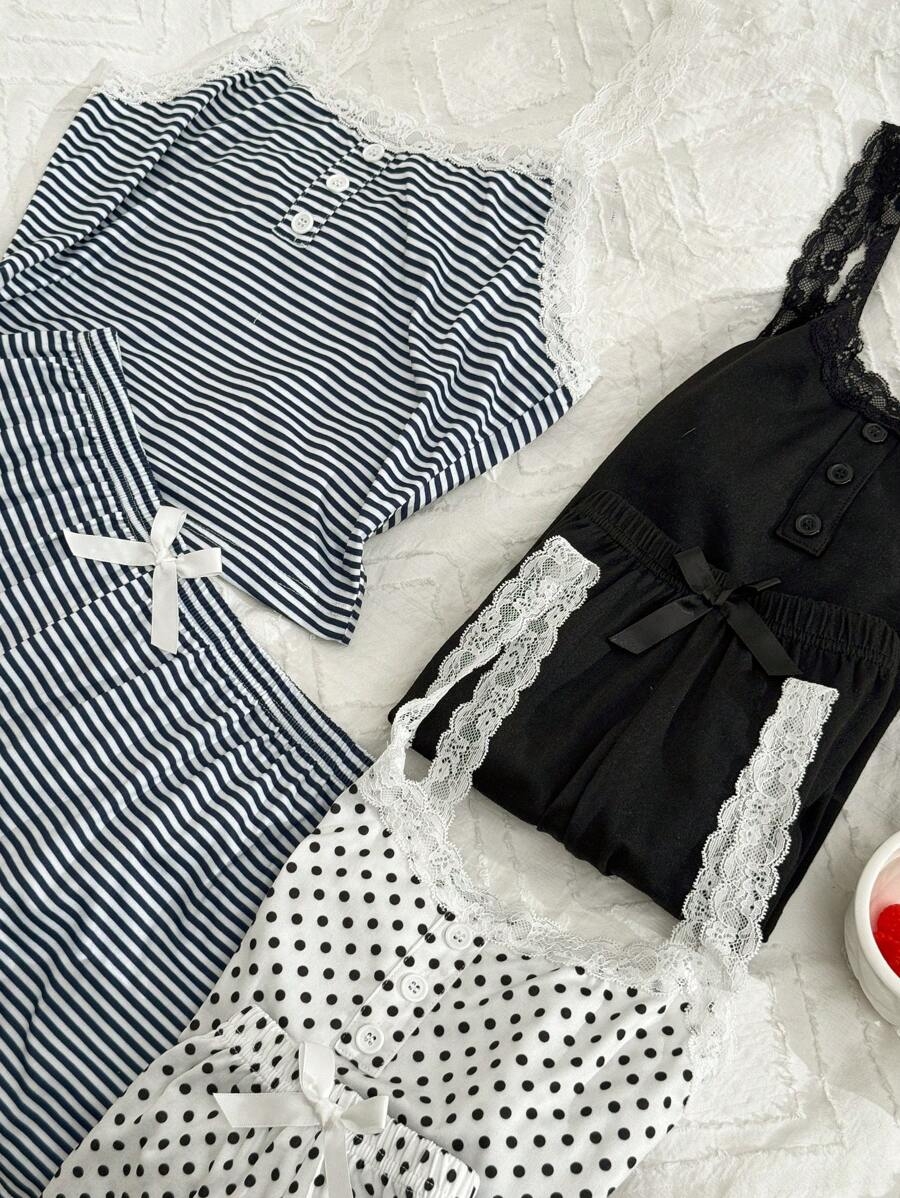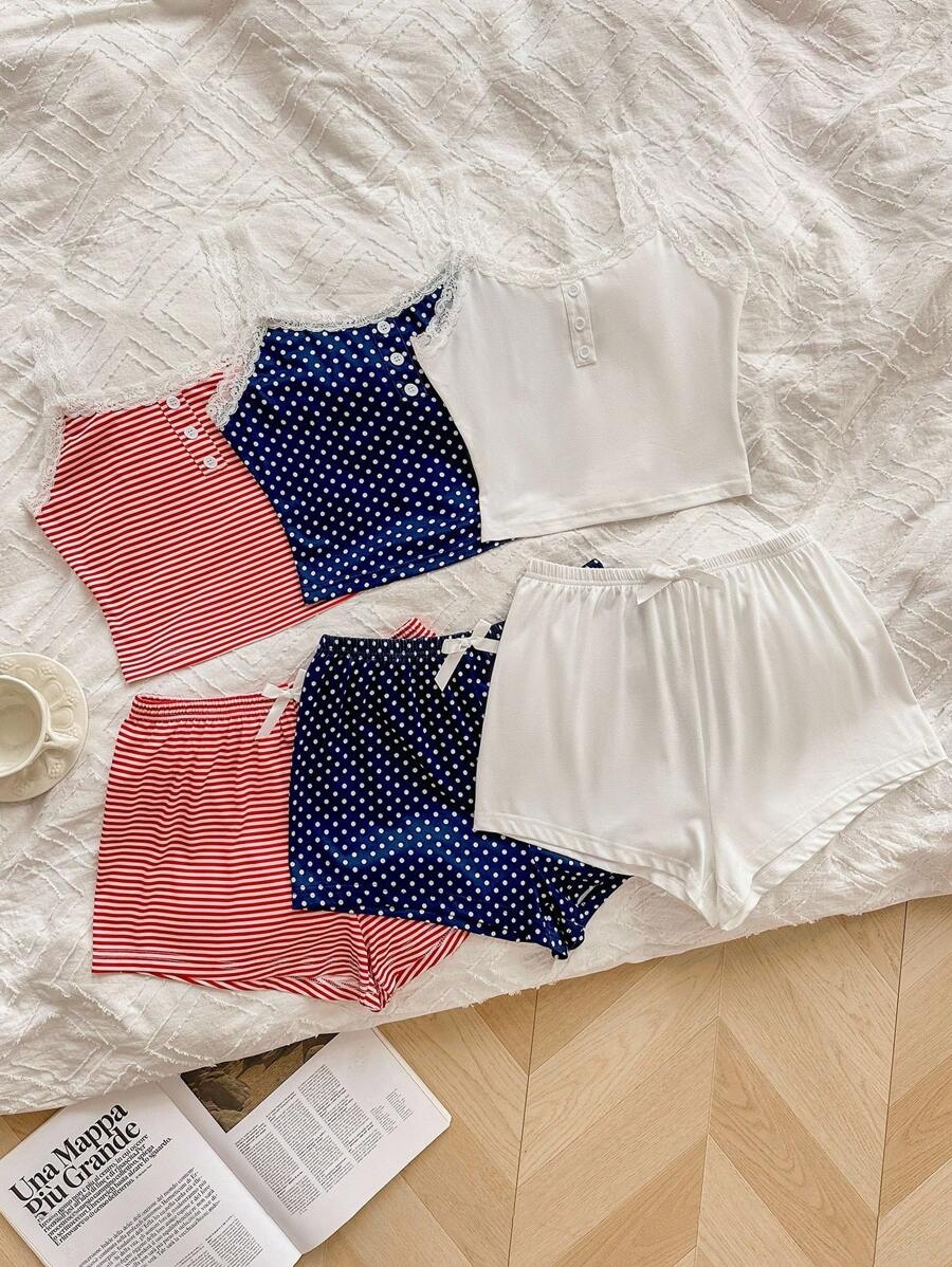 SHEIN 6pcs Women Casual Fitted False Placket Lace Patchwork Floral Print Camisole Shorts Pajama Set Bow TieĀ  Cozy And Elegant Details