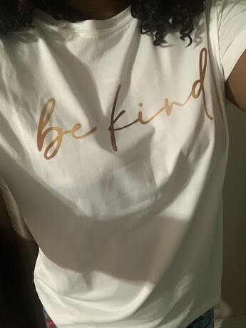 I really like this shirt! It’s very soft and well made and has a great simple statement on it. Medium fit best for my chest. I am 34D, 126 lbs for reference and didn’t want it too tight, so I sized up from my normal small size in tops.