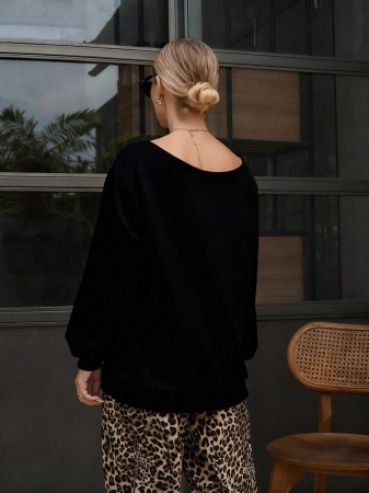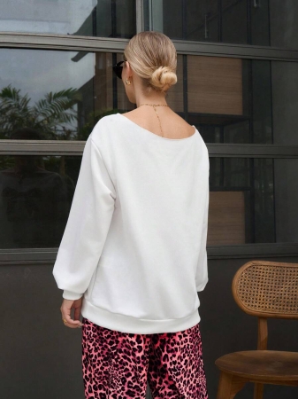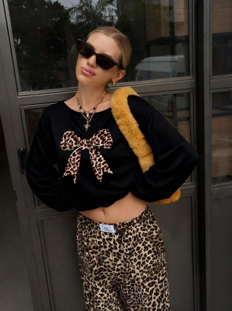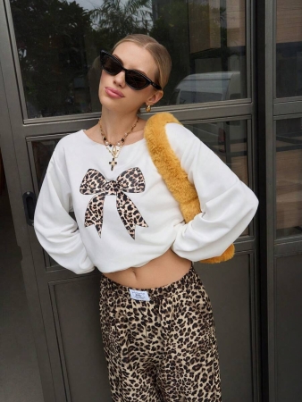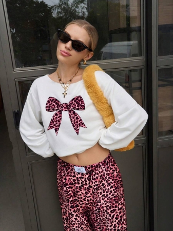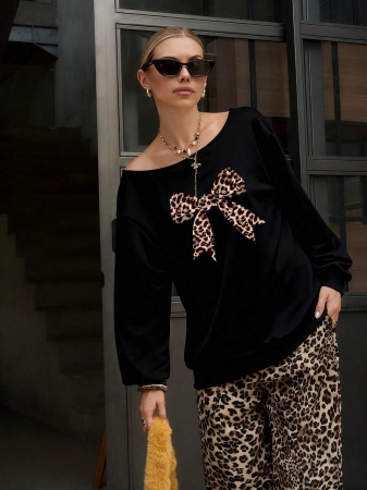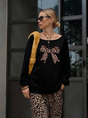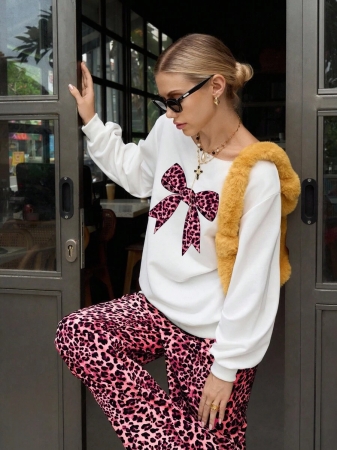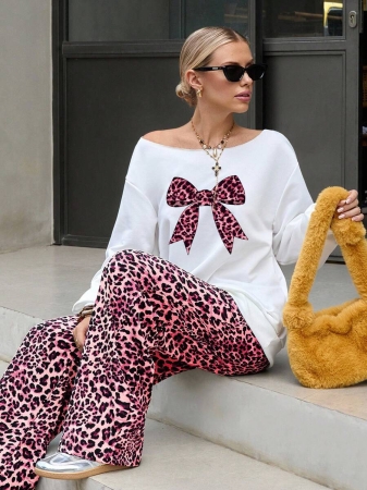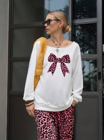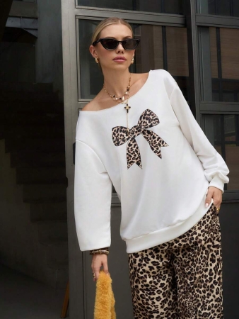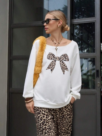 SHEIN EZwear Women’s Oversized White Drop Shoulder Leopard Print & Bow Graphic Loose Thin Long Sleeve Sweatshirt In Fall/Winter