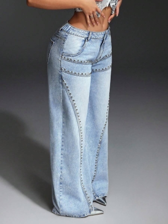 Slaydiva Plus Size Light-Colored Rivet Decor Casual Loose Fit Denim Wide Leg Pants/Winter